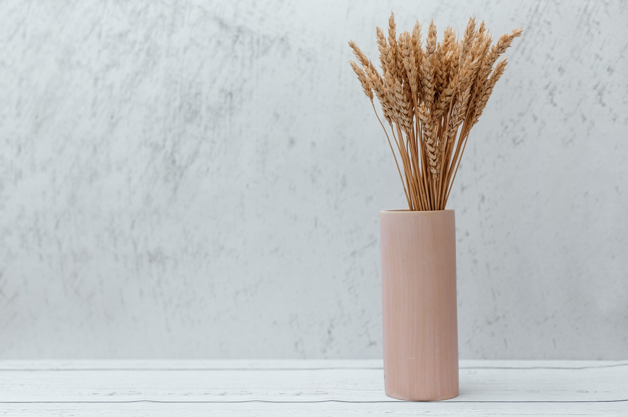 Lorsqu’il s’agit de décorer vos espaces intérieurs, vous pouvez facilement créer un centre de table sculptural captivant avec quelques branches feuillues. Dans cet exemple, le grand vase a une touche terreuse et est complété par des épillets de blé.