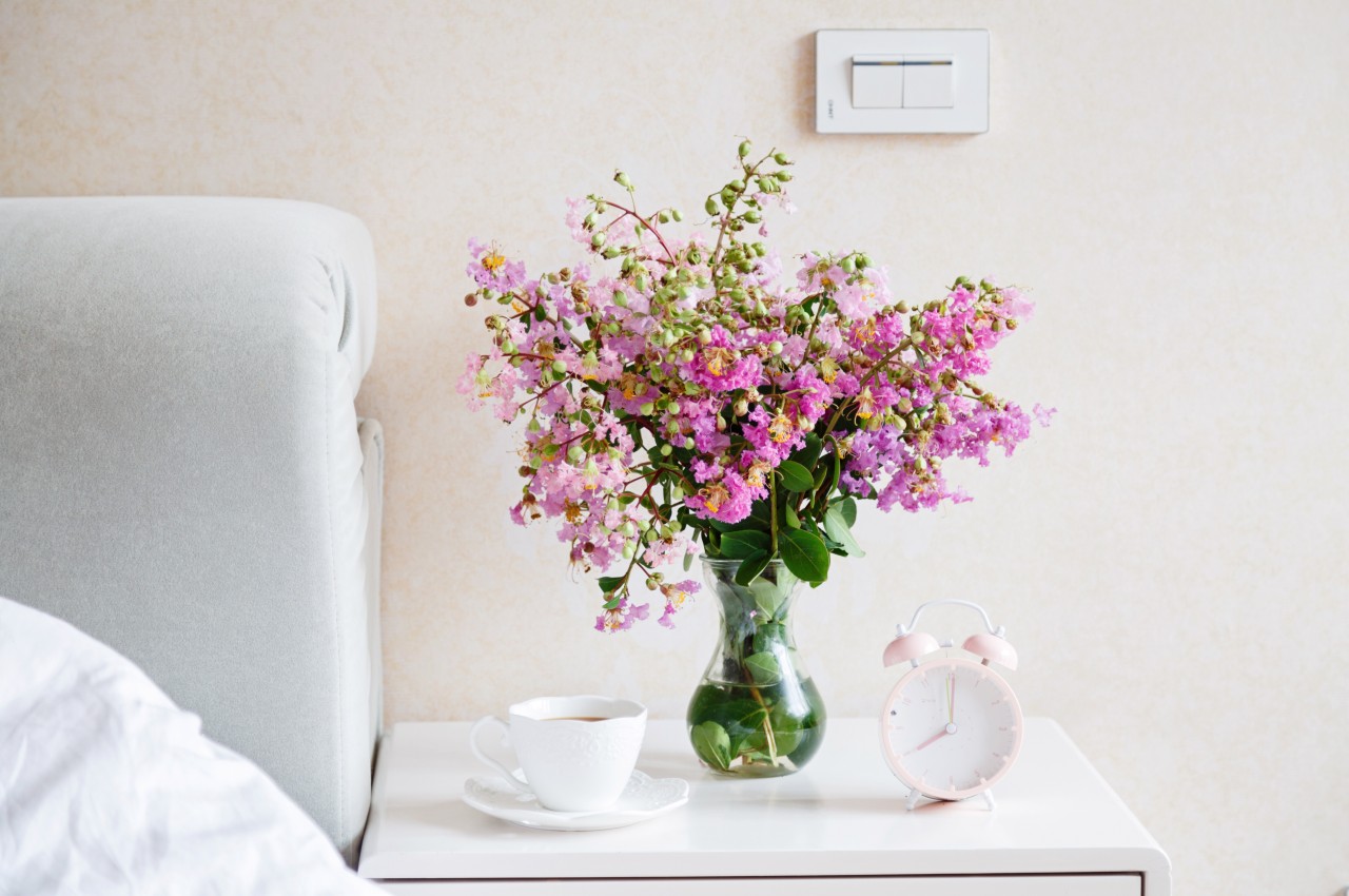 Dans cette chambre à l’esthétique minimaliste, la table de chevet intègre un vase et se transforme en un espace chaleureux et douillet.