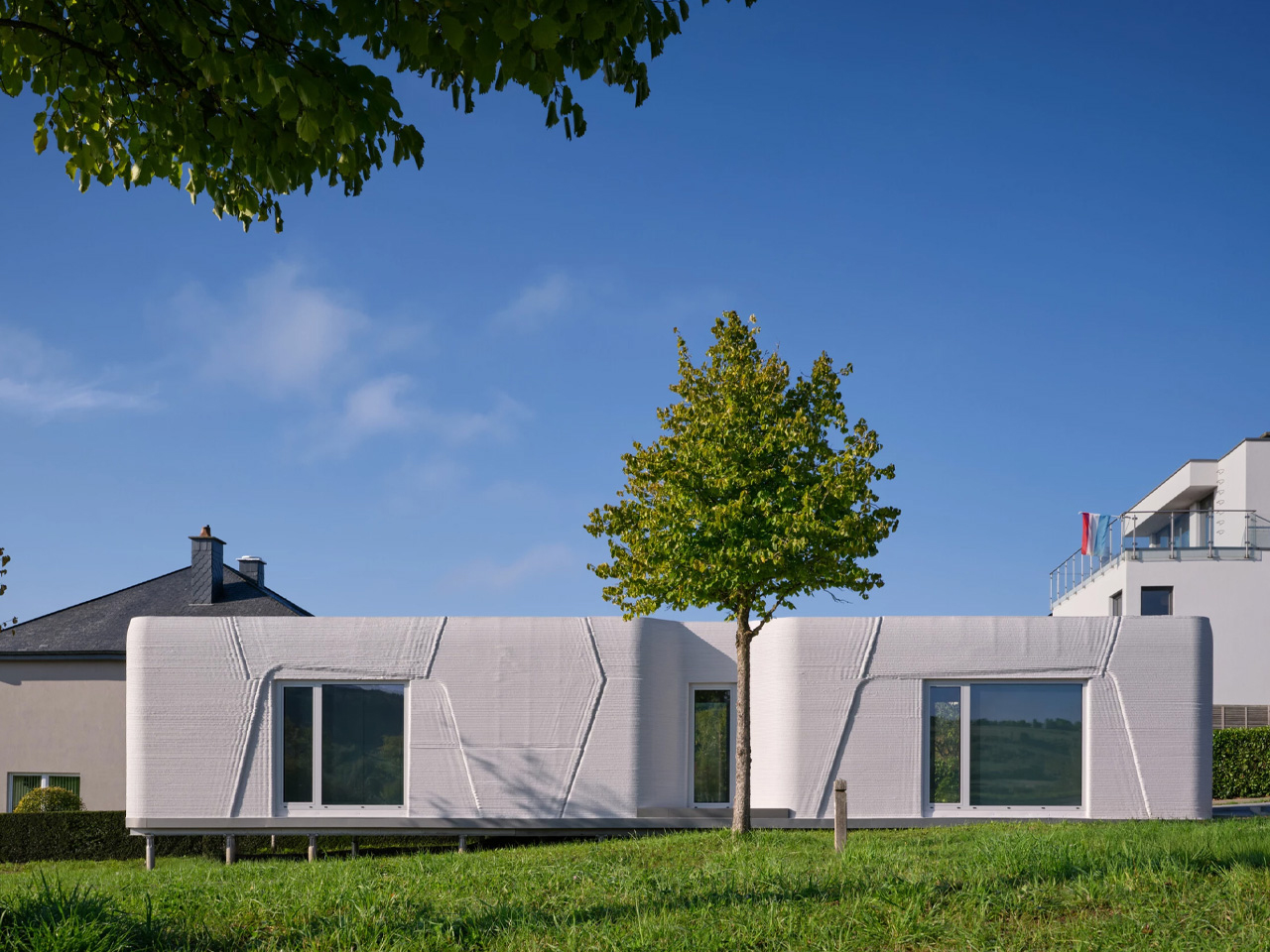 La Tiny House Lux est le premier produit résidentiel imprimé en 3D du Luxembourg, conçu par ODA Architects en tant qu’unité de logement compacte et autonome pour des parcelles urbaines difficiles. Construite à Niederanven à l’aide de l’impression 3D en béton sur site et de granulats locaux, cette maison démontre comment une technologie de construction avancée peut débloquer le potentiel de terrains étroits, auparavant inutilisables. Mesurant seulement 3,5 mètres de large et 17,72 mètres de profondeur, la structure de 47 mètres carrés est conçue pour l’efficacité, avec des murs en béton imprimés achevés en environ une semaine et la construction finale réalisée en quatre semaines. Sa surface en béton nervurée fonctionne à la fois comme structure et finition, créant un extérieur durable et à faible entretien.