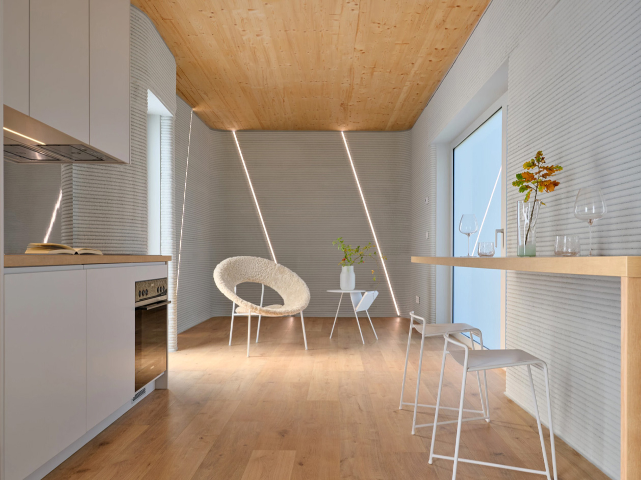 À l’intérieur, la maison privilégie la clarté et la performance. Un agencement linéaire s’étend de l’entrée orientée au sud jusqu’à l’arrière, maximisant la lumière naturelle et la ventilation, tandis que les services sont intégrés soignement sur les côtés. Le chauffage par le sol, alimenté par des panneaux solaires sur le toit, assure l’autonomie énergétique et réduit les coûts d’exploitation. En tant que solution de logement réplicable, la Tiny House Lux positionne l’impression 3D comme un produit viable et évolutif pour les municipalités cherchant des options résidentielles efficaces et abordables.