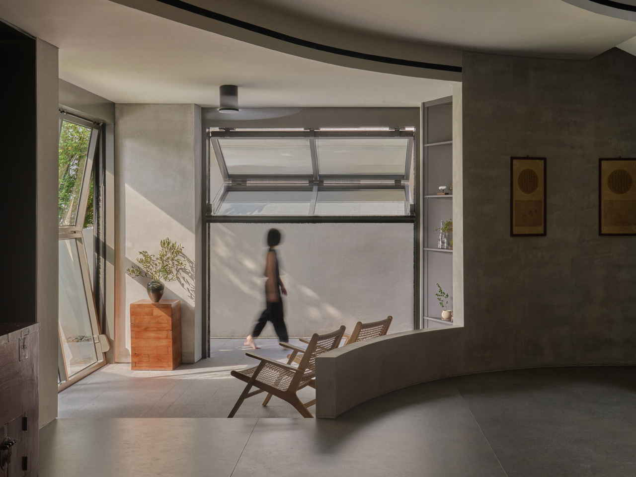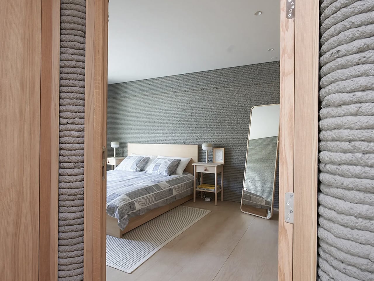 La façade en béton stratifié de la maison révèle ouvertement sa construction imprimée en 3D, la plupart des murs étant fabriqués sur place par une imprimante robotique. Ces lignes texturées se poursuivent à l’intérieur, créant une continuité visuelle à travers les intérieurs. Au centre, un vide vertical dramatique connecte tous les niveaux, attirant la lumière du jour et améliorant la ventilation tout en ajoutant une générosité spatiale. Les surfaces en béton exposées réduisent le besoin de finitions supplémentaires, célébrant l’honnêteté du matériau et du processus.