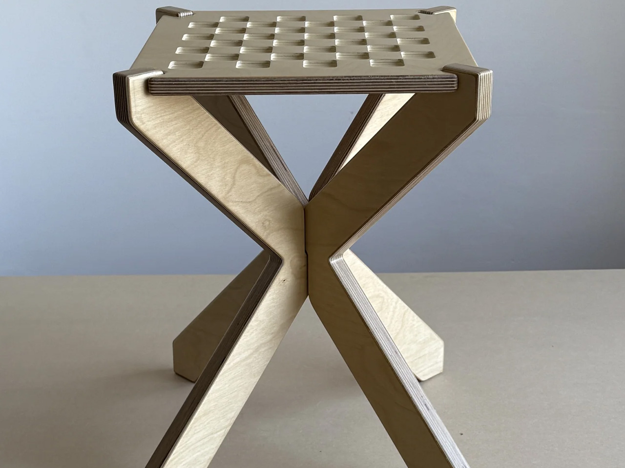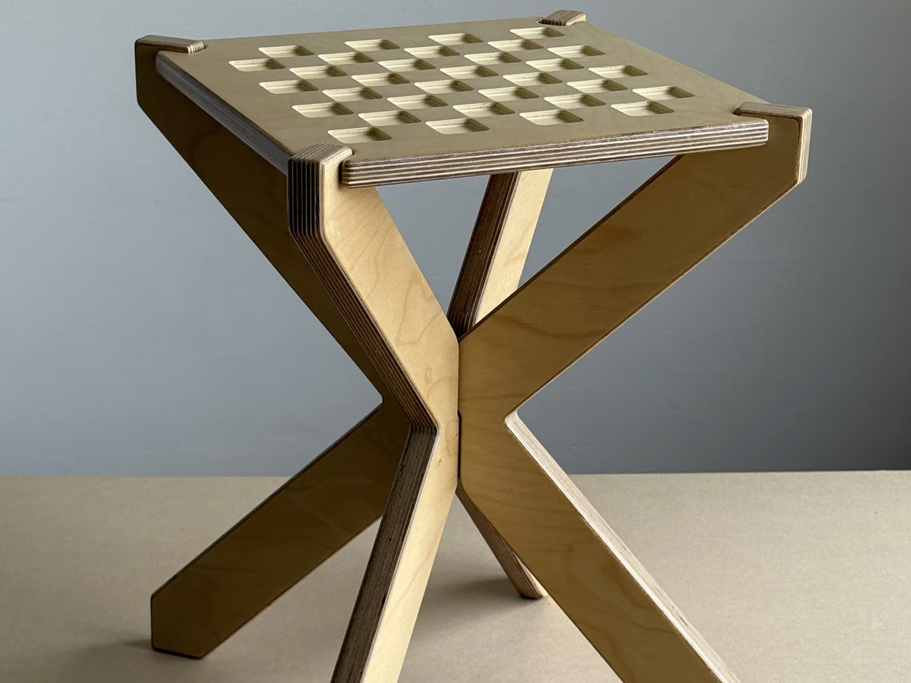 Le Tabouret de Chaos/Table de Chevalet est un meuble polyvalent réalisé en contreplaqué de bouleau européen, laquée pour un fini lisse. Sa particularité réside dans son plateau usiné avec un motif d’échiquier encastré, pouvant être retourné pour révéler une surface plate. Ce meuble fonctionne aussi bien comme table d’appoint que comme échiquier, idéal pour les petits espaces.