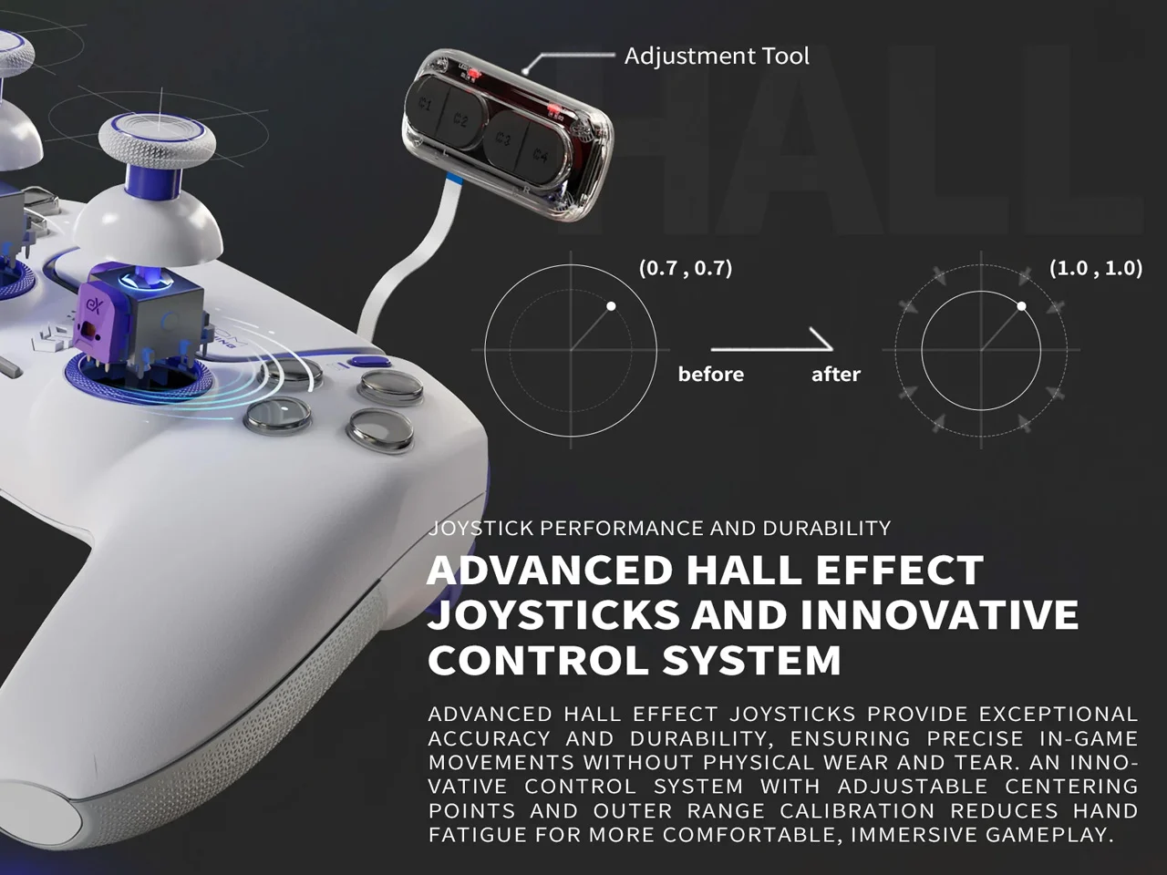 - La technologie Hall Effect couvre à la fois les joysticks et les déclencheurs, garantissant une durabilité exceptionnelle.