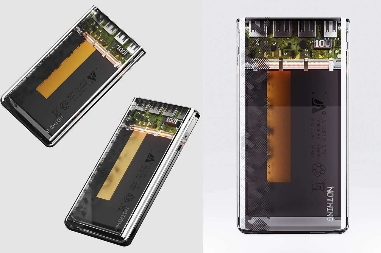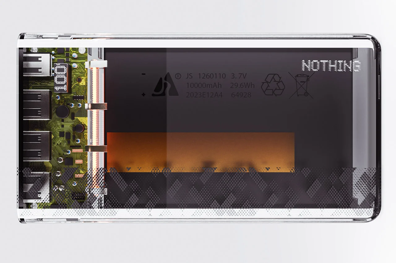 La batterie externe Nothing est conçue avec un boîtier transparent qui permet de visualiser son architecture interne. Elle offre une charge fiable et une esthétique moderne, tout en étant compatible avec d’autres appareils de la marque.