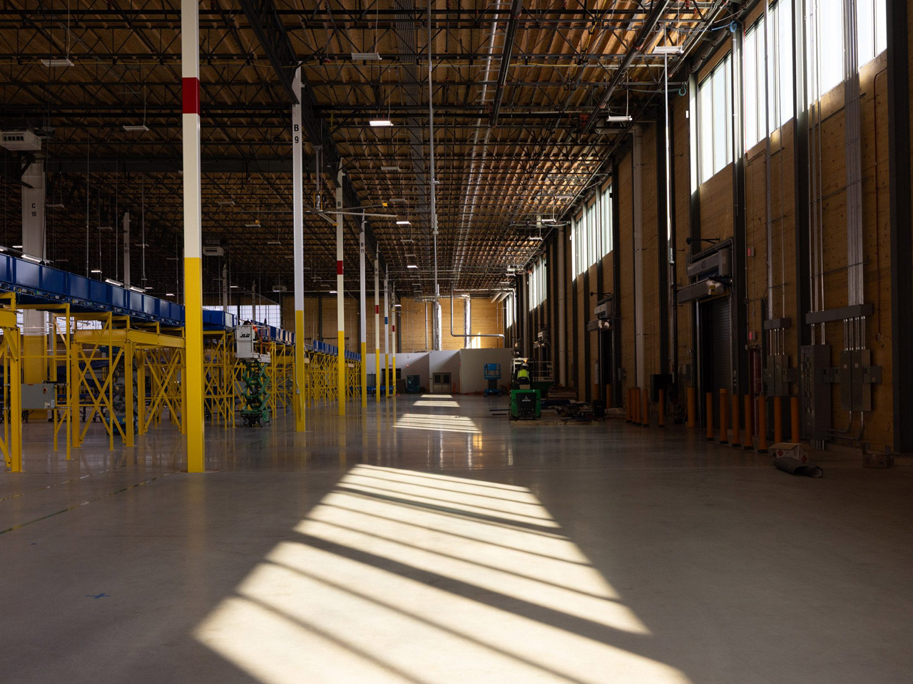 En entrant dans le bâtiment, les différences deviennent encore plus apparentes. Les fenêtres claires inondent l’espace de lumière naturelle, réduisant ainsi le besoin d’éclairage artificiel, qui représente généralement une part importante des coûts énergétiques dans les opérations d’entrepôt. Le bâtiment est équipé de systèmes d’éclairage circadien qui s’ajustent tout au long de la journée pour correspondre aux motifs de lumière naturelle, maintenant les travailleurs alertes sans l’éclat intense des éclairages industriels standard.