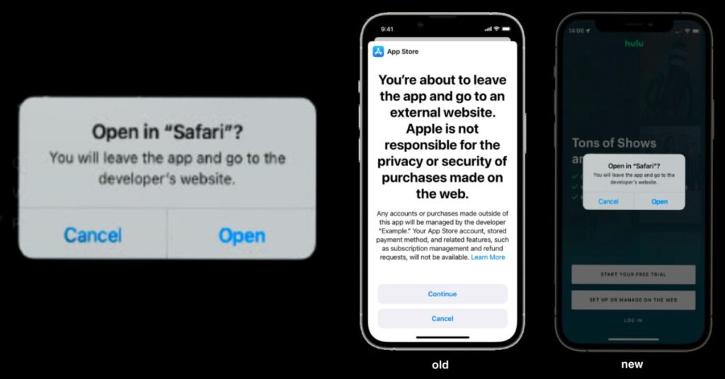 Cela signifie que Apple peut exiger une alerte intermédiaire pour informer l’utilisateur qu’il quitte l’application d’origine. Cependant, cette notification ne peut pas être aussi intrusive que celle qui était précédemment appliquée. Le juge a même présenté un exemple d’une alerte simplifiée suggérée, contrastant fortement avec la "scare sheet" fulgurante qu’Apple avait précédemment déployée.