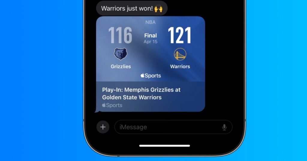 La fonctionnalité de partage de cartes de jeu génère des cartes de jeu dynamiques, et non pas seulement des statistiques de jeu statiques, pour toute ligue prise en charge par Apple Sports. Ces cartes peuvent être partagées directement via iMessage ou sur les réseaux sociaux pour des événements en direct, à venir ou déjà terminés.