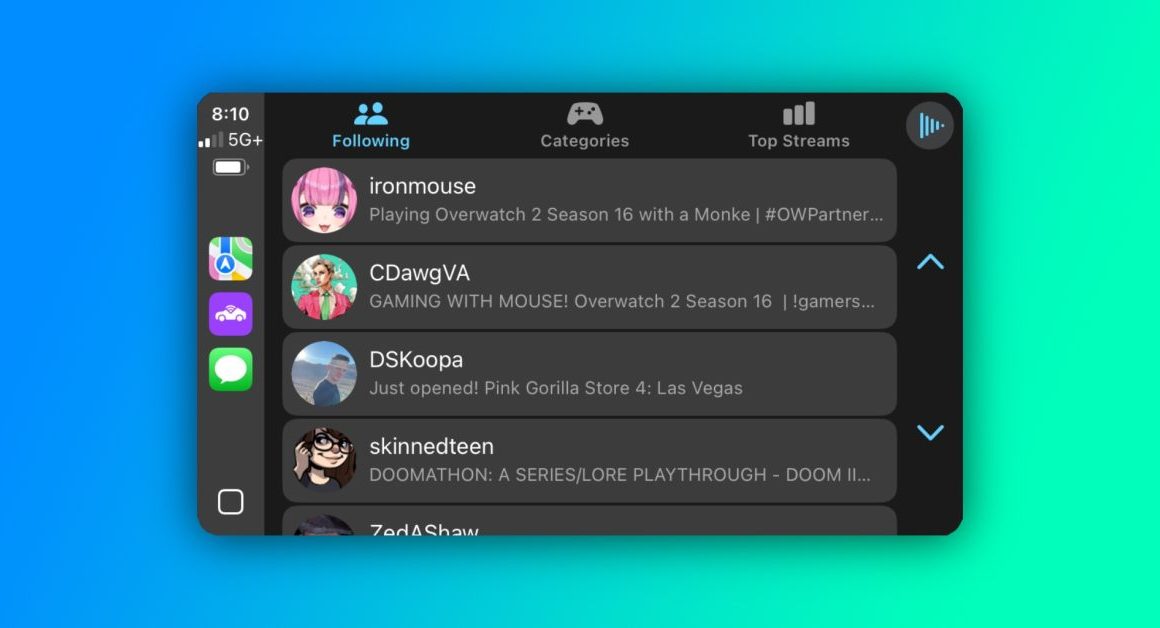 Avec CarStream pour Twitch, vous pouvez facilement parcourir différentes catégories, défiler à travers les flux les plus populaires ou même trouver des streamers que vous suivez, et commencer à écouter un flux sans effort. Il prend en charge les commandes physiques de votre voiture pour naviguer encore plus facilement.