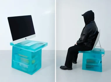 Découvrez la chaise en résine révolutionnaire intégrant un véritable iMac, un Magic Keyboard et une souris, scellée à…