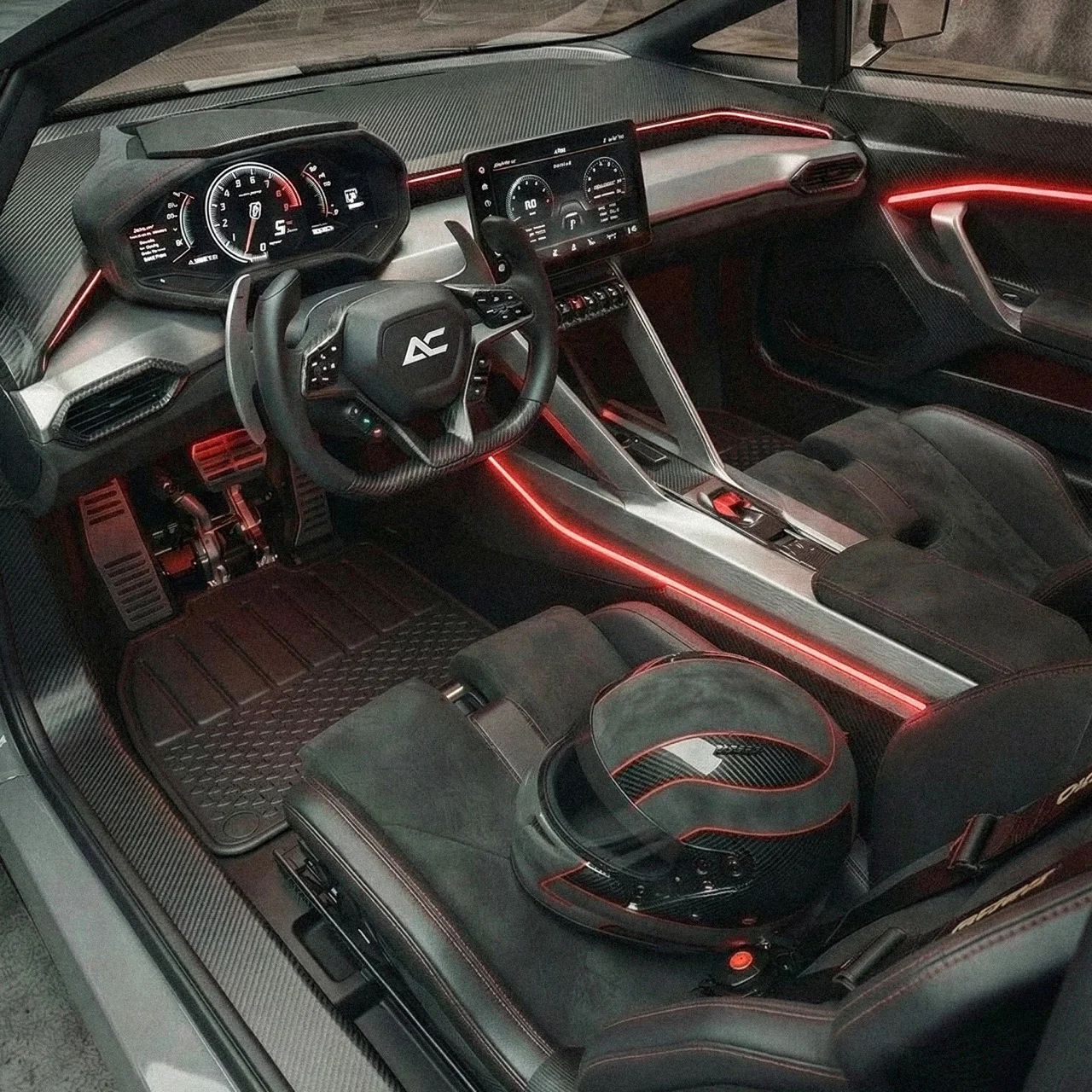 L’intérieur de l’AC Buggy est conçu avec un minimalisme agressif et du carbone, mettant en avant des éclairages d’accent rouge et des commandes tactile qui suggèrent des connexions mécaniques directes.