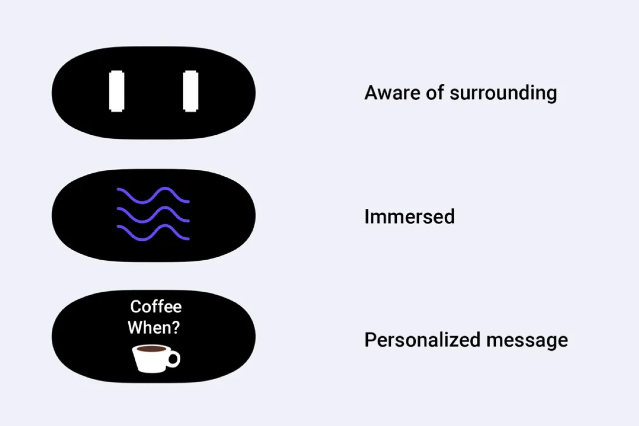 Les casques de réalité virtuelle ont un design familier, mais au lieu d’avoir des écrans attachés aux yeux, ils sont montés sur une charnière en forme de visière qui peut être pivotée vers le haut lorsqu’elle n’est pas utilisée, ce qui permet d’interagir avec le monde réel. Pendant ce temps, un écran situé à l’avant fonctionne comme celui du Vision Pro, donnant aux personnes autour de vous une idée de votre statut, que vous soyez occupé, libre, ou même que vous ayez envie d’un café.