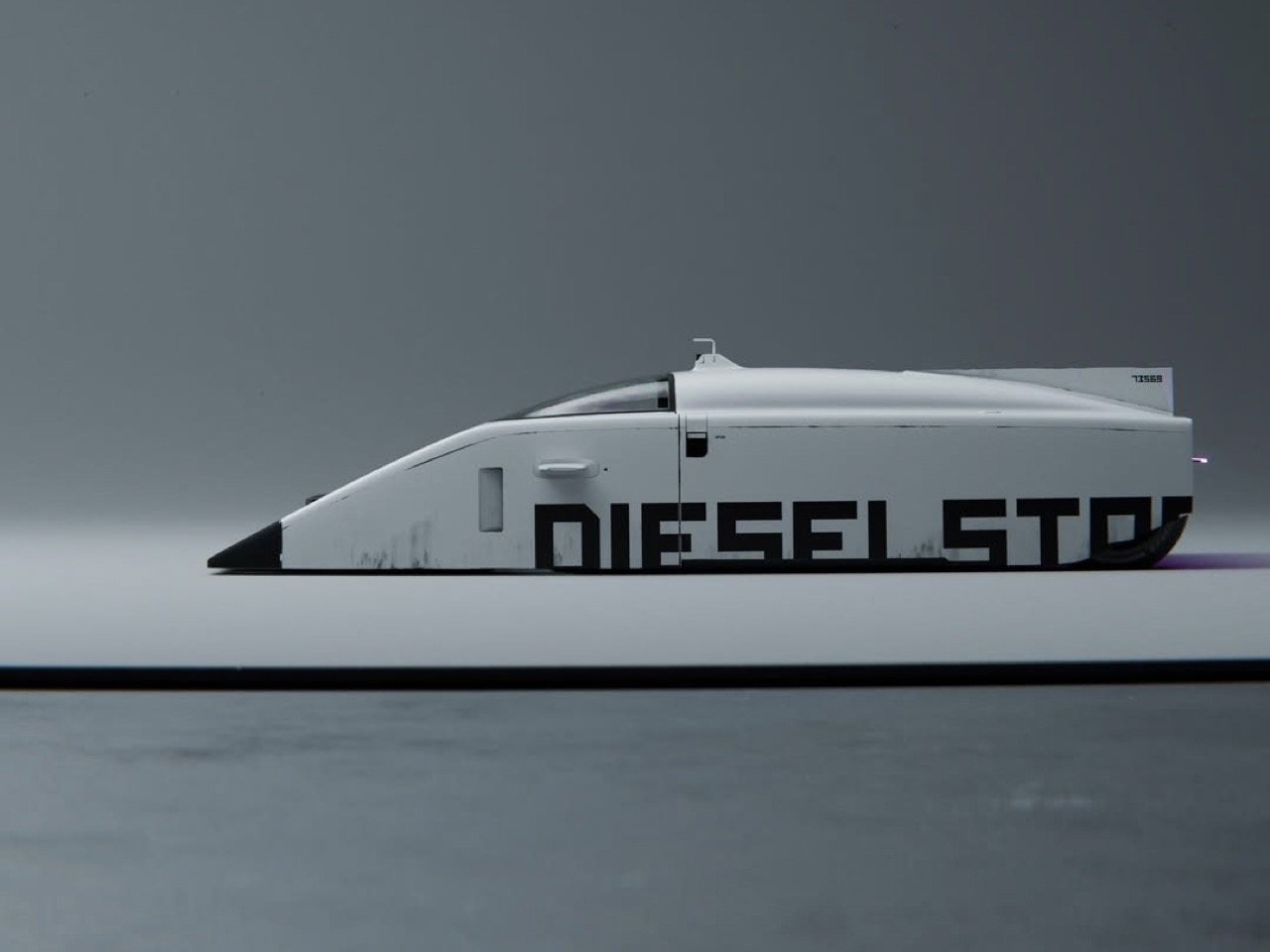 La DIESELSTAR, conçue par Godwin Smith, incarne l’idéologie des voitures à la forme en coin des années 70, tout en se projetant dans un avenir dystopique. Dans cette vision, la vitesse n’est pas seulement excitante, mais fait partie intégrante de la philosophie du design. La voiture semble avoir été modelée dans un bloc d’aluminium par une machine n’ayant aucune patience pour les courbes. Son cockpit se présente comme une fente, les roues sont partiellement dissimulées, et l’arrière dévoile ses entrailles mécaniques comme un défi. C’est un projectile terrestre, destiné à dominer les lignes droites et rien d’autre.