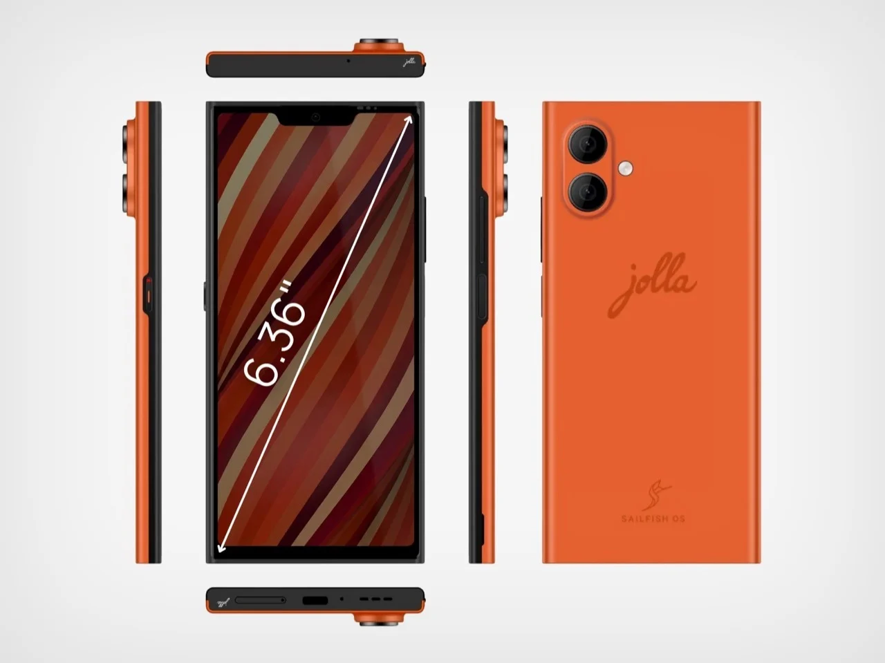 Le langage de design met en avant un minimalisme scandinave avec une touche de nostalgie. La version orange (parmi trois finitions disponibles avec le blanc neige et le noir Kaamos) affiche une teinte corail vibrante rappelant les plastiques osés de Nokia sur des appareils comme le Lumia 920. Le panneau arrière est lisse, amovible et arbore la marque « jolla » ainsi que le logo de Sailfish OS en bas. Deux objectifs photo sont installés dans le coin supérieur gauche, tandis que l’ensemble du téléphone affiche un design angulaire et utilitaire, loin de l’esthétique courbée qui domine les modèles phares Android. Les boutons physiques se trouvent sur le bord droit, le dessus présente un port pour accessoires modulaires et le bas est doté d’un port USB-C flanqué de grilles de haut-parleur. L’avant est entièrement consacré à l’écran, sans bords ni découpes, offrant une toile propre et continue pour l’affichage.