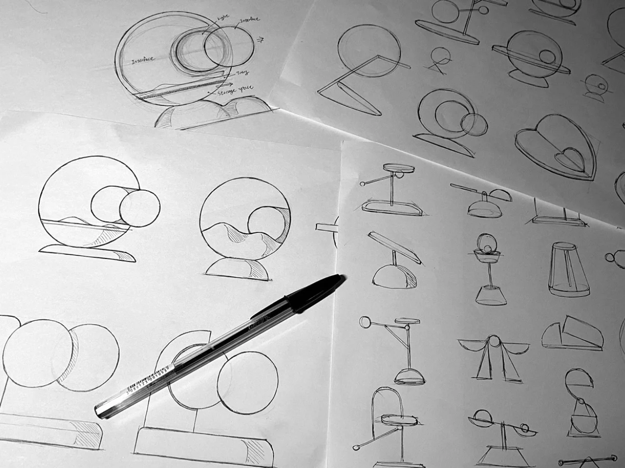En examinant le processus de développement de Kim, on peut discerner la réflexion qui a guidé le perfectionnement du concept. Les esquisses montrent des dizaines d’itérations, chacune explorant différentes configurations autour du thème circulaire. Les photos de prototypage révèlent une attention minutieuse à la manière dont les mains interagissent avec l’objet, comment le plateau doit être positionné et comment la lampe doit projeter sa lumière sans être intrusive.