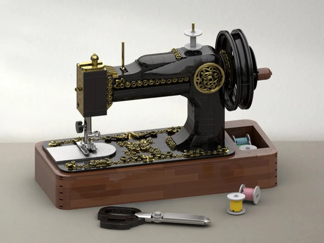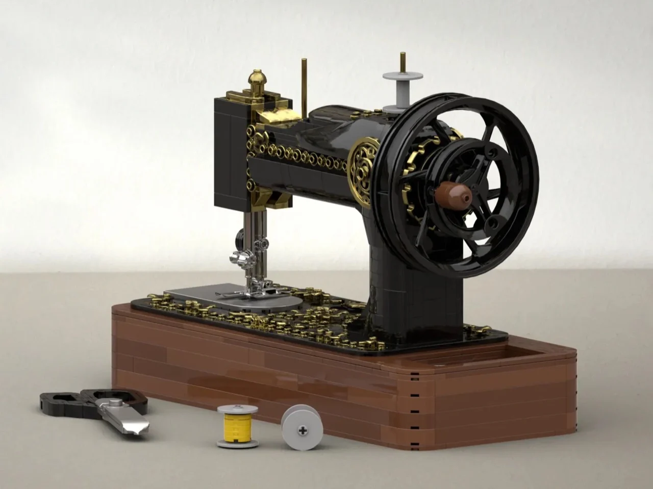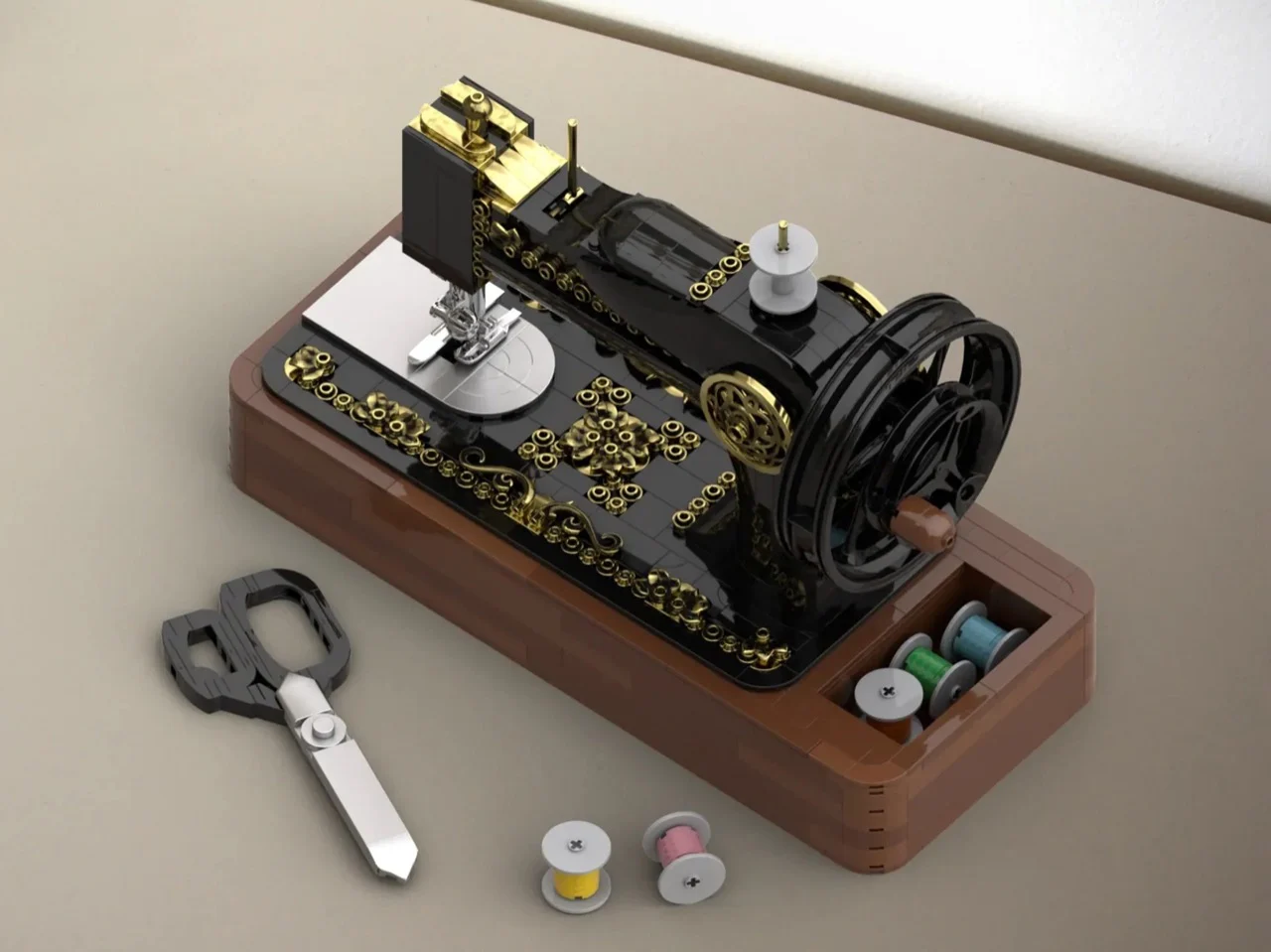 Cette machine à coudre LEGO est à la fois fonctionnelle et esthétique, avec des éléments tels qu’une manivelle rotative, des bobines de fil colorées et des ciseaux en briques LEGO.