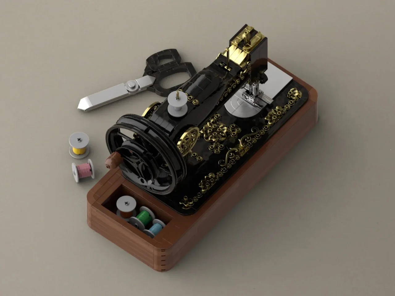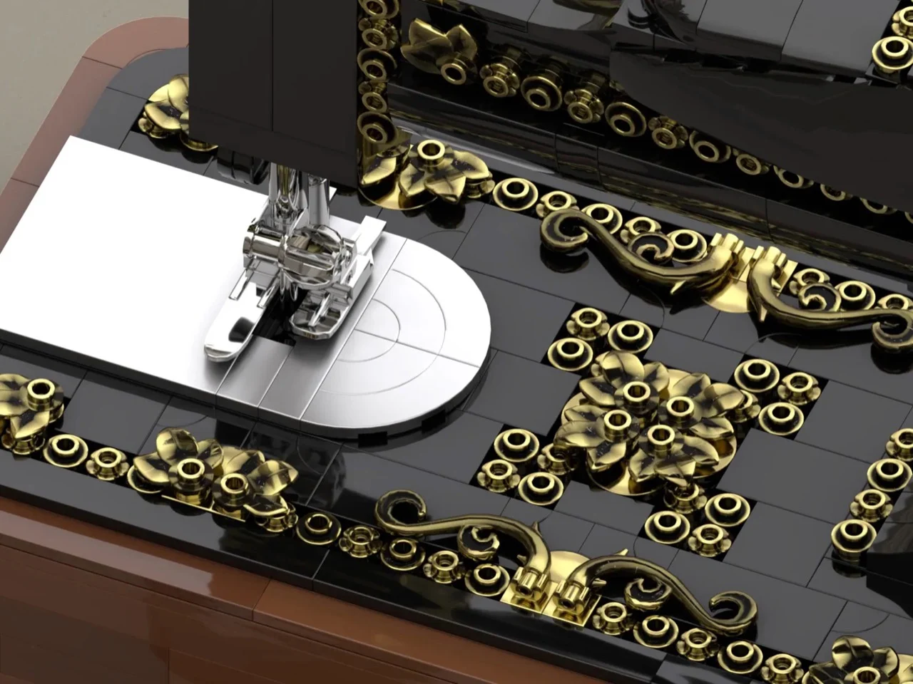 Le modèle de BrickStability est d’une précision inégalée. Non seulement il fonctionne—la manivelle tourne et l’élément d’aiguille se déplace—mais il est également livré avec des bobines de fil LEGO colorées, accompagnées de ciseaux en briques LEGO. La machine se distingue par sa couleur noire, fidèle à la plupart des machines de l’époque, tout en intégrant un travail de briques dorées. Ce détail rappelle le design orné des anciennes machines à coudre.