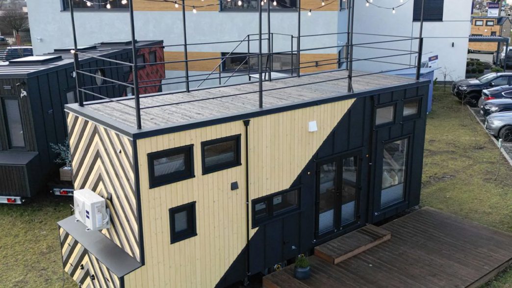 Cette petite maison spacieuse s’appelle Mobi Individual Baobab. Elle comprend deux chambres et un canapé-lit pour les invités. L’extérieur est équipé d’un escalier menant à une terrasse sur le toit. La maison a été conçue par Mobi House (Pologne) et repose sur une remorque à trois essieux. Elle mesure 8,4 mètres de long et son extérieur est en tôle. La tôle est combinée à des accents d’épicéa et à un toit métallique. L’échelle extérieure permet d’accéder au toit-terrasse, qui peut être rabattu lorsqu’il n’est pas utilisé.