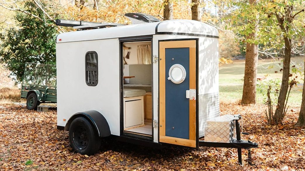 Baptisée Ramblenook Camper, cette petite maison confortable a été construite à partir d’une vieille remorque de fret. C’est à la fois une tiny house et un camping-car. Elle est équipée d’un coin salon et d’un coin couchage, ainsi que d’un coin cuisine – ; le tout dans un espace compact de 2,5 mètres. La maison a été construite à partir d’une remorque cargo à un seul essieu fabriquée en 2003. Les trous dans l’extérieur métallique ont dû être réparés et une nouvelle couche de peinture a été appliquée pour restaurer la remorque. Une petite boîte de rangement a également été installée à l’extérieur.