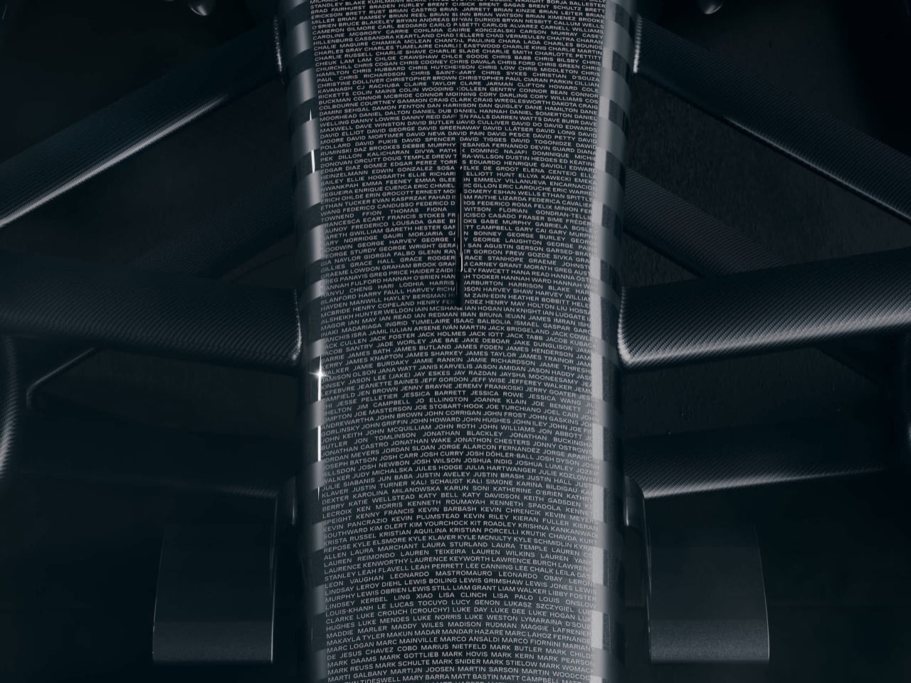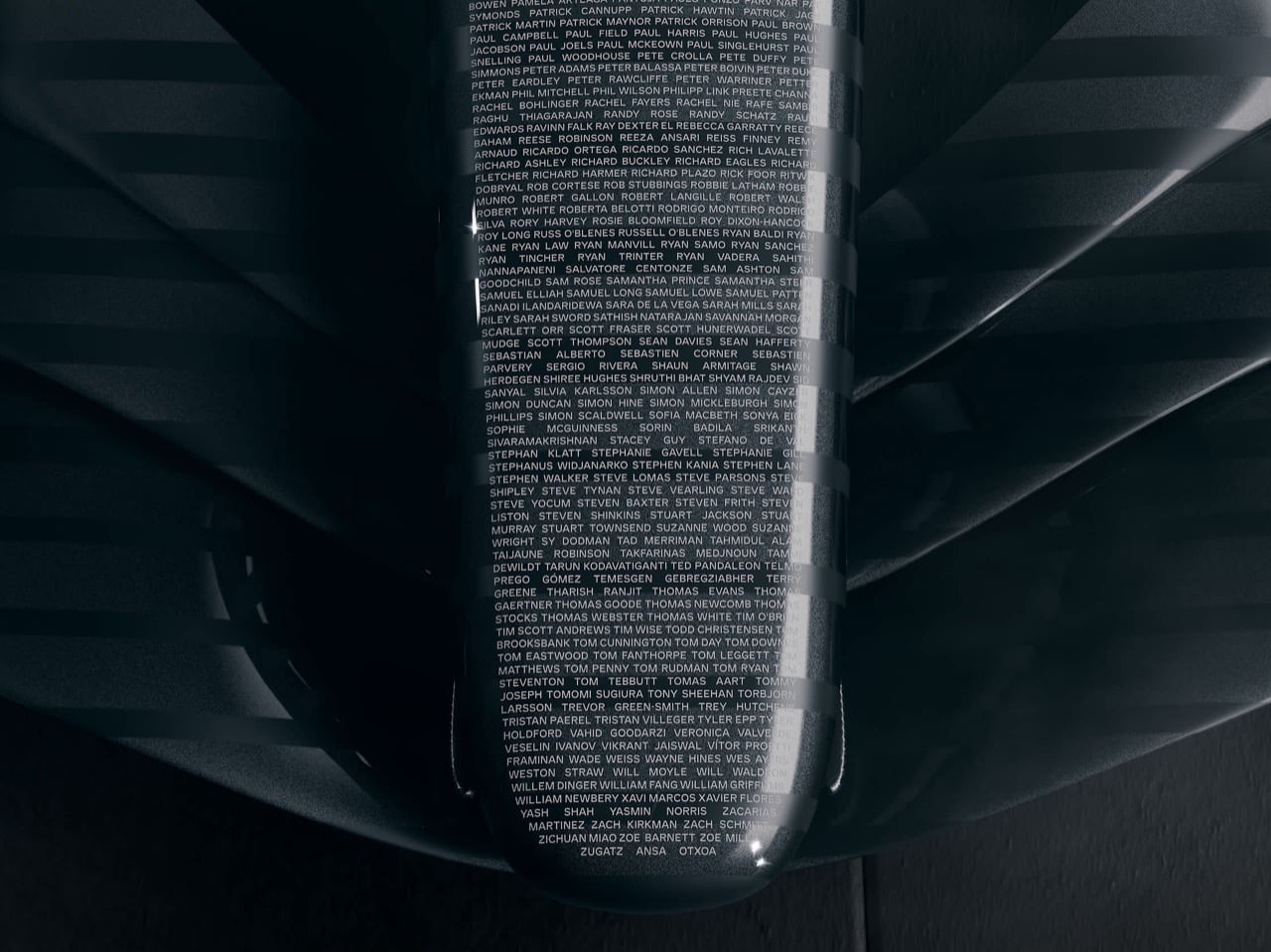 Les noms des membres fondateurs sont intégrés à la section du nez de la voiture, ce qui humanise la marque tout en soulignant que ce programme a été réalisé par des personnes spécifiques.