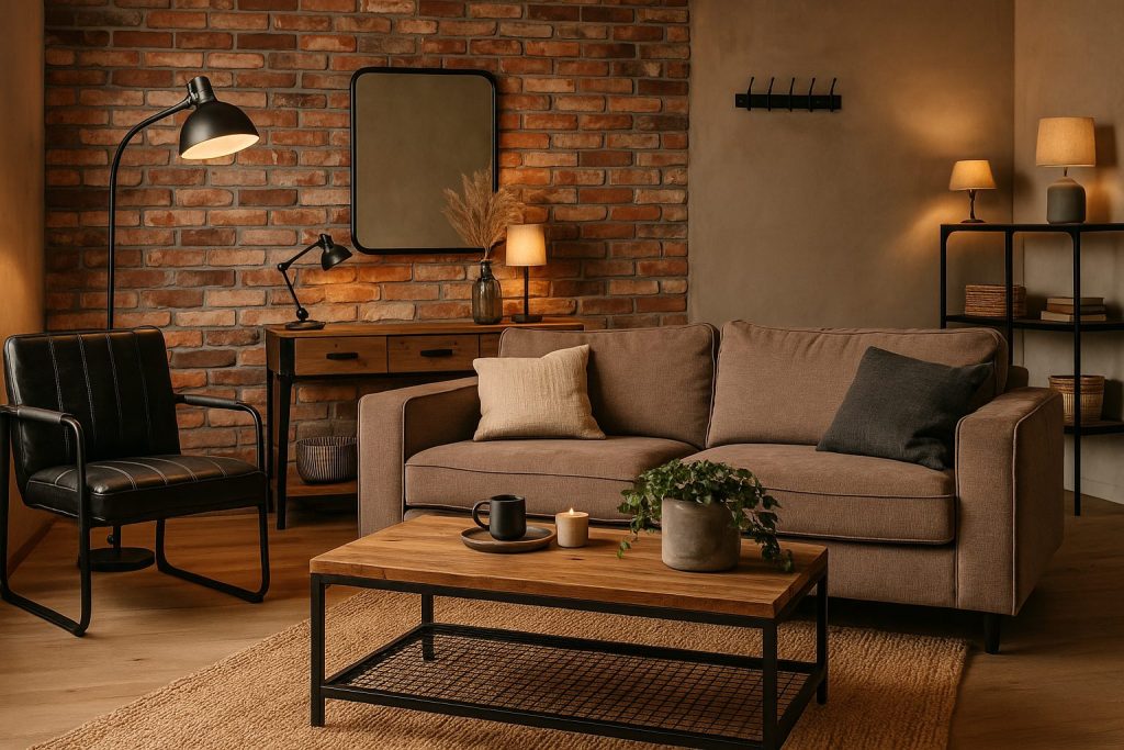 La réussite d’une déco de salon industrielle cocooning repose sur une harmonie entre le brut et le doux. Le bois et le métal donnent du caractère, tandis que les textiles, les lumières et les teintes naturelles apportent le confort.