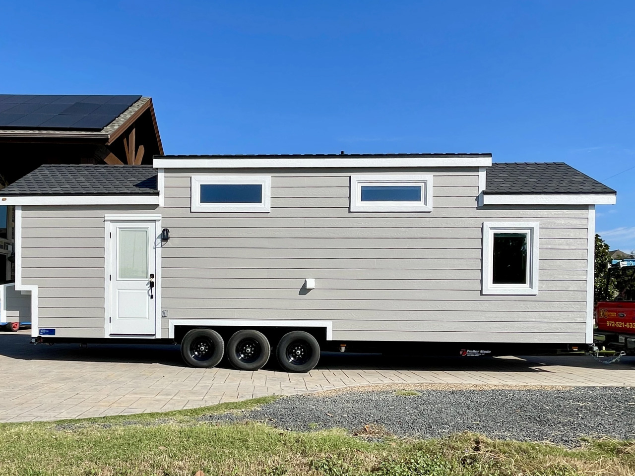Le modèle "New Chapter" est une maison compacte de 32 pieds qui offre une largeur de 10 pieds, permettant un intérieur plus spacieux. Il est conçu pour le transport avec une remorque à triple essieu, favorisant un aménagement intérieur plus substantiel tout en restant mobile.