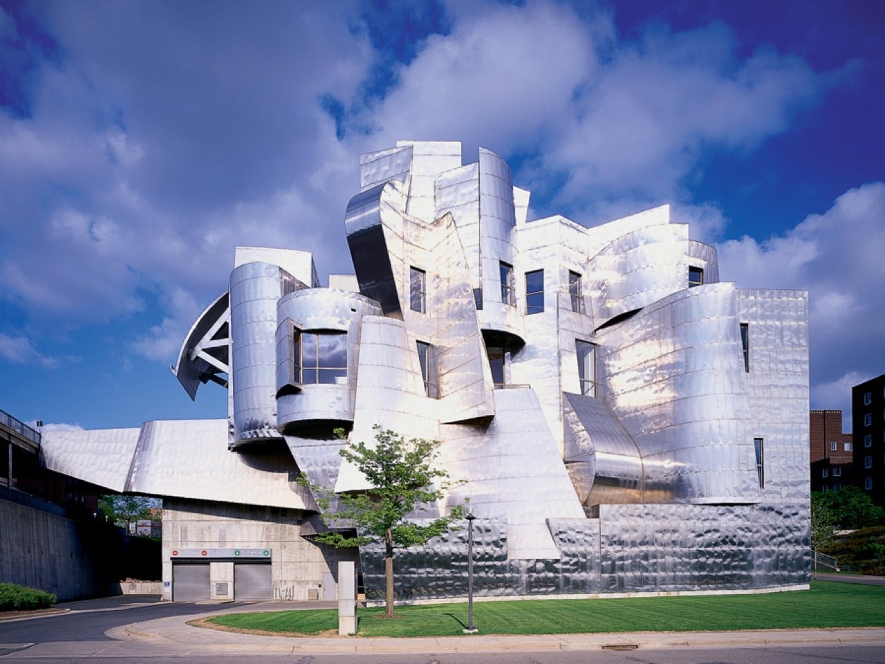 Le Weisman Art Museum de l’Université du Minnesota représente un manifeste compact de l’intérêt de Gehry pour les surfaces réfléchissantes et les formes fracturées. Bien que la façade côté campus soit relativement calme et en briques, la vue sur le fleuve Mississippi révèle une cascade de panneaux en acier inoxydable qui capturent la lumière avec des motifs changeants.