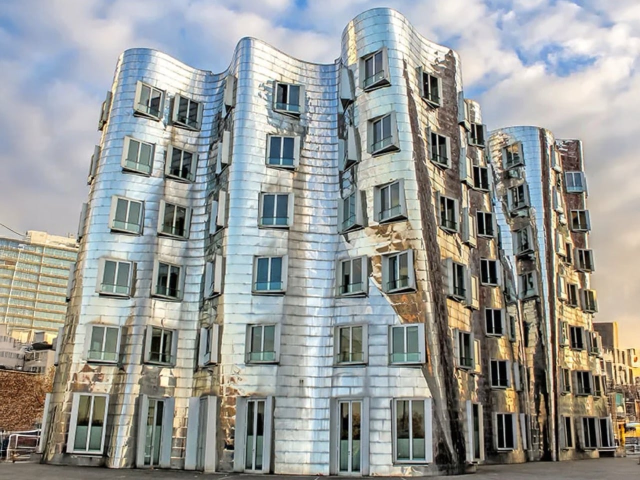 Dominant le MedienHafen de Düsseldorf, le complexe Neuer Zollhof met en avant la capacité de Gehry à composer des bâtiments en sculpture urbaine. Les trois tours, chacune avec son identité matérielle, semblent pencher et vaciller, influencées par les vents portuaires. Leurs façades ondulantes calment les reflets du ciel tout en ajoutant une qualité cinétique au paysage urbain.
