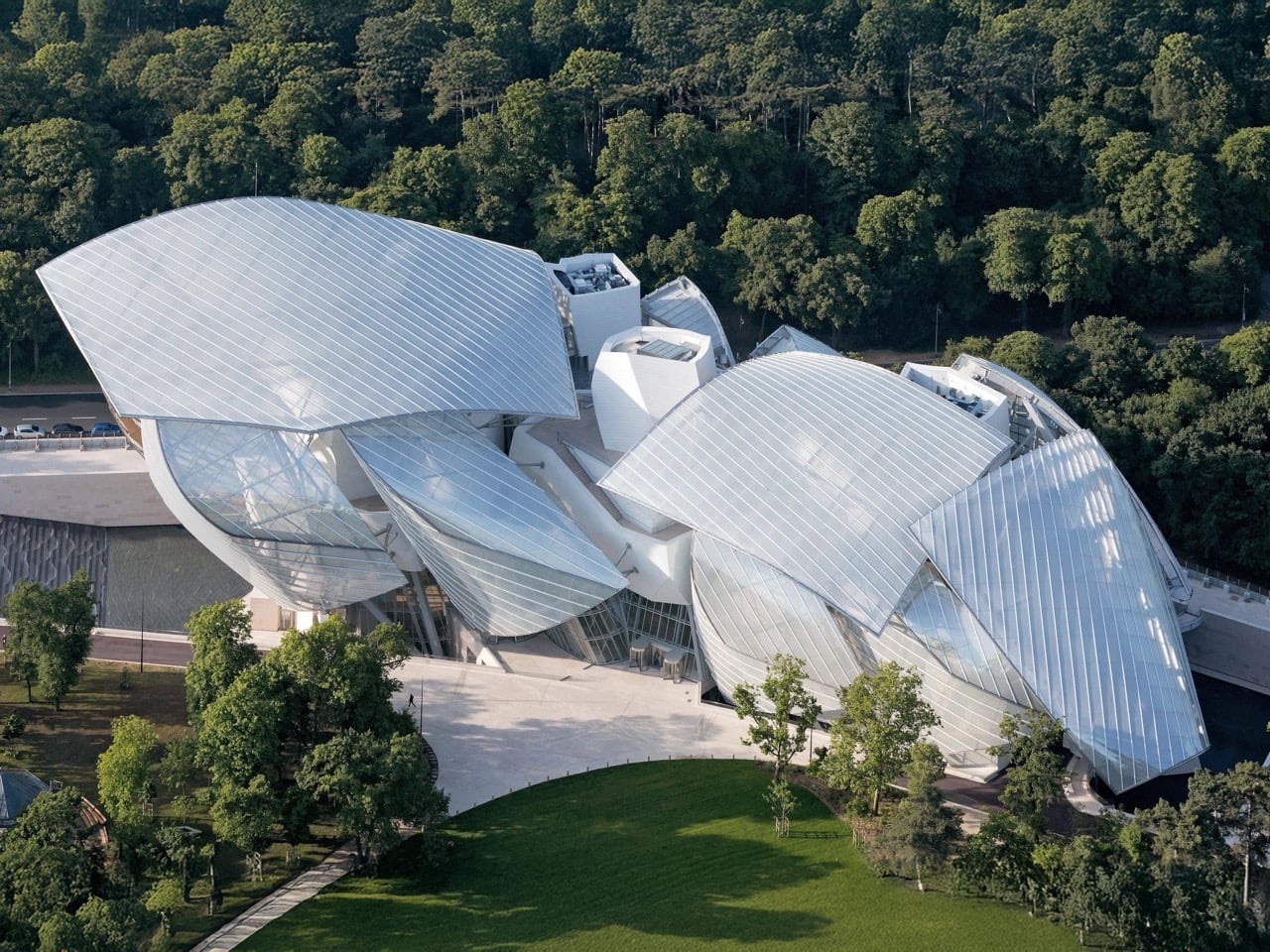 La Fondation Louis Vuitton de Gehry témoigne de la rencontre de l’art, de l’architecture et du paysage. Ressemblant à un vaisseau futuriste amarré dans le Bois de Boulogne, ses "voiles" en verre captent des reflets de la nature environnante. Insérée dans le jardin historique d’Acclimatation, la structure joue un jeu de dissimulation et de révélation, se présentant tantôt comme transparente, tantôt comme un objet cristallin.