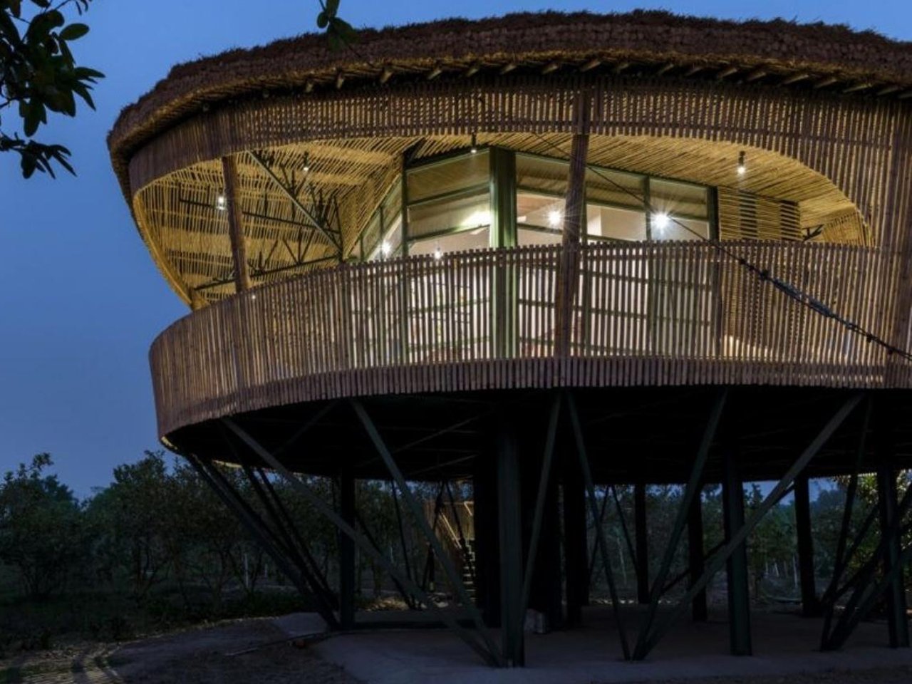 La Maison Macha, située dans la campagne de Kolkata, est un exemple de retraite en bambou harmonisant durabilité, minimalisme et beauté naturelle. Élevée de neuf pieds au-dessus du sol pour se protéger contre les inondations et la faune, cette structure combine la construction traditionnelle en bambou avec des renforcements métalliques pour garantir sa stabilité.