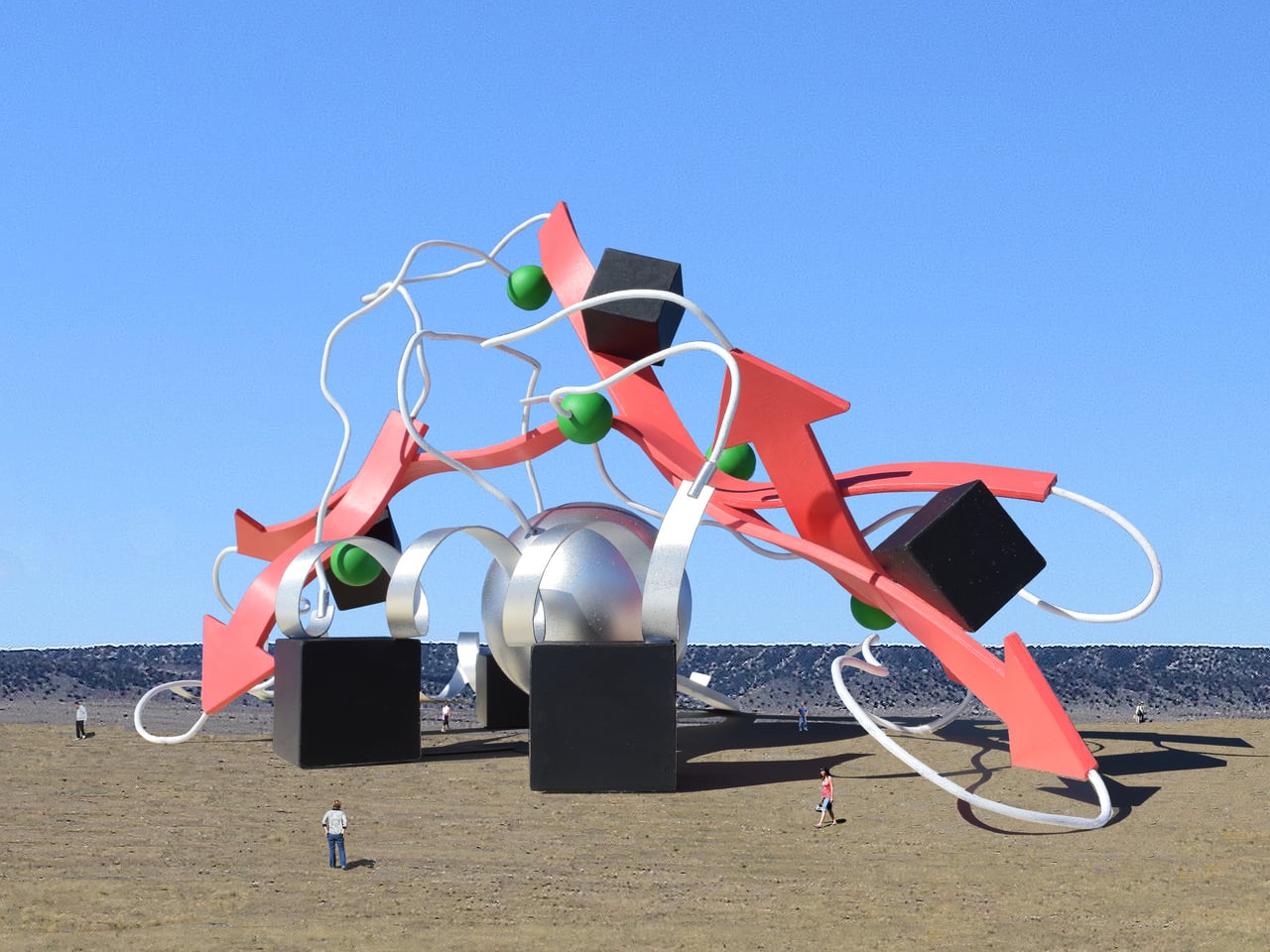 Les trois cubes noirs abritent des espaces de recherche, tandis qu’une grande sphère argentée constitue la salle d’exposition. Cependant, ces éléments sont entremêlés dans des flèches rouges vives, des spirales blanches, des sphères vertes et des cubes plus petits. Les différentes salles fonctionnelles se trouvent à l’intérieur de ces solides alors que des éléments symboliques les enveloppent et les traversent, créant une structure littéralement nouée dans son propre sujet d’étude. À mesure que vous vous approchez, vous apercevez une gigantesque molécule repliée émergeant du sol.