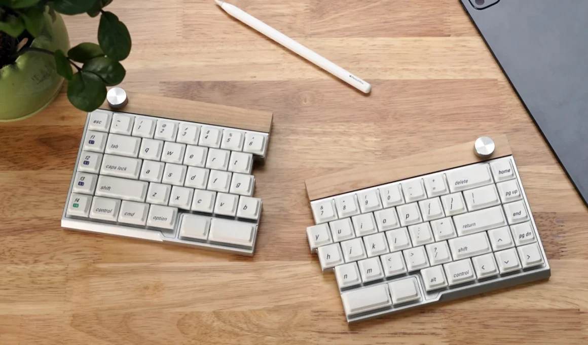 Conçu par JezailFunder, ce clavier fait l’objet d’une campagne Kickstarter qui a d’ores et déjà dépassé son objectif de 5 000 $ pour atteindre plus de 170 000 $ de promesses. Voici ce qui fait la particularité de ce clavier : il est fabriqué en aluminium usiné CNC avec des accents en bois, entièrement sans fil entre les deux moitiés et compatible avec de nombreux dispositifs. De plus, il est hot-swappable, ce qui permet de choisir vos propres interrupteurs et de les changer facilement. Un bouton programmable vient également enrichir les fonctionnalités, devenant ainsi presque indispensable pour les claviers haut de gamme. Les prix débutent à 199 $ pour les premiers contributeurs, avec une expédition prévue pour mai, si la production reste dans les délais.