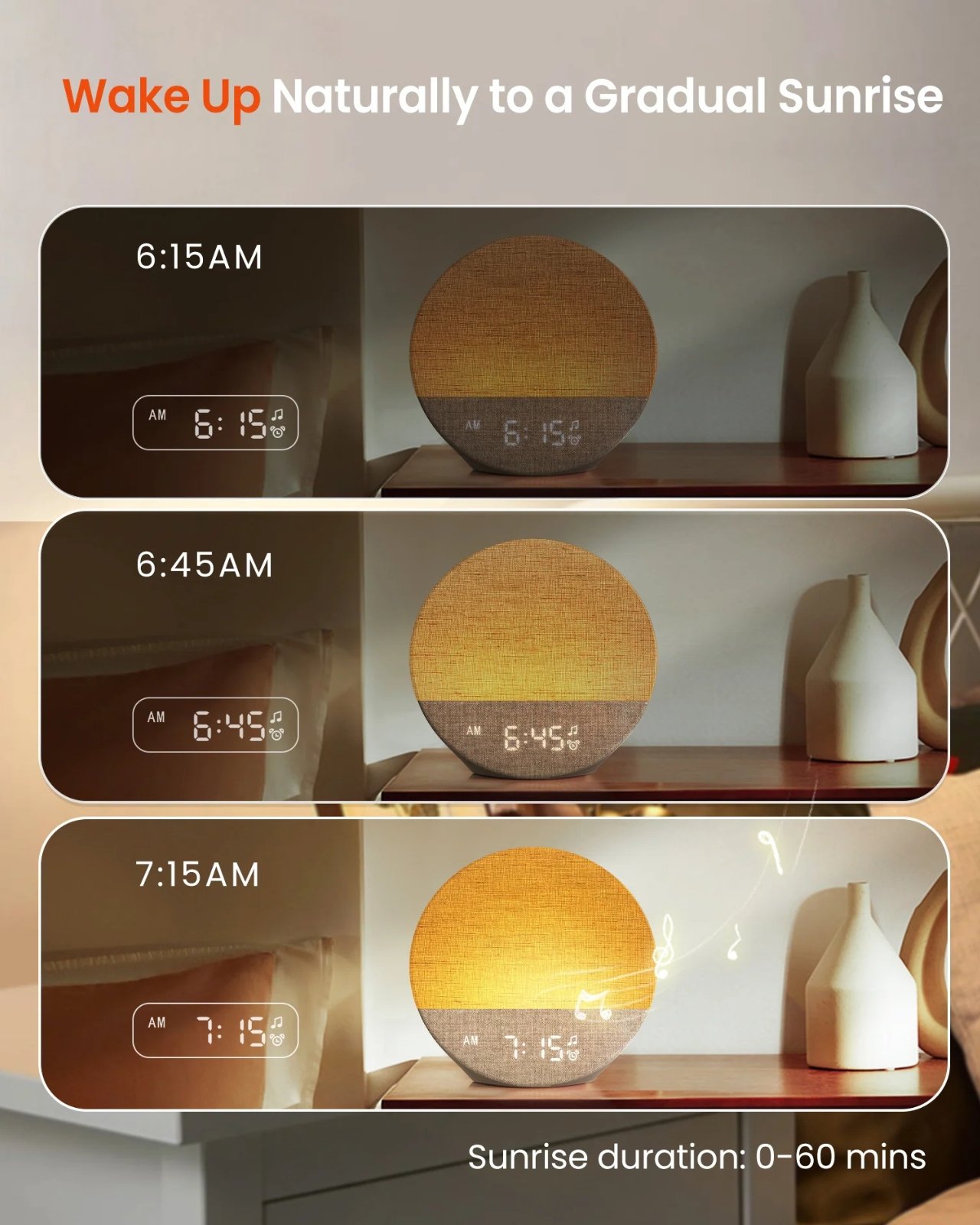 Le Sunrise 1 permet de simuler un lever de soleil en augmentant progressivement la luminosité de 0% à 100% sur des intervalles de temps de 15, 30, 45 ou 60 minutes avant l’alarme prévue.