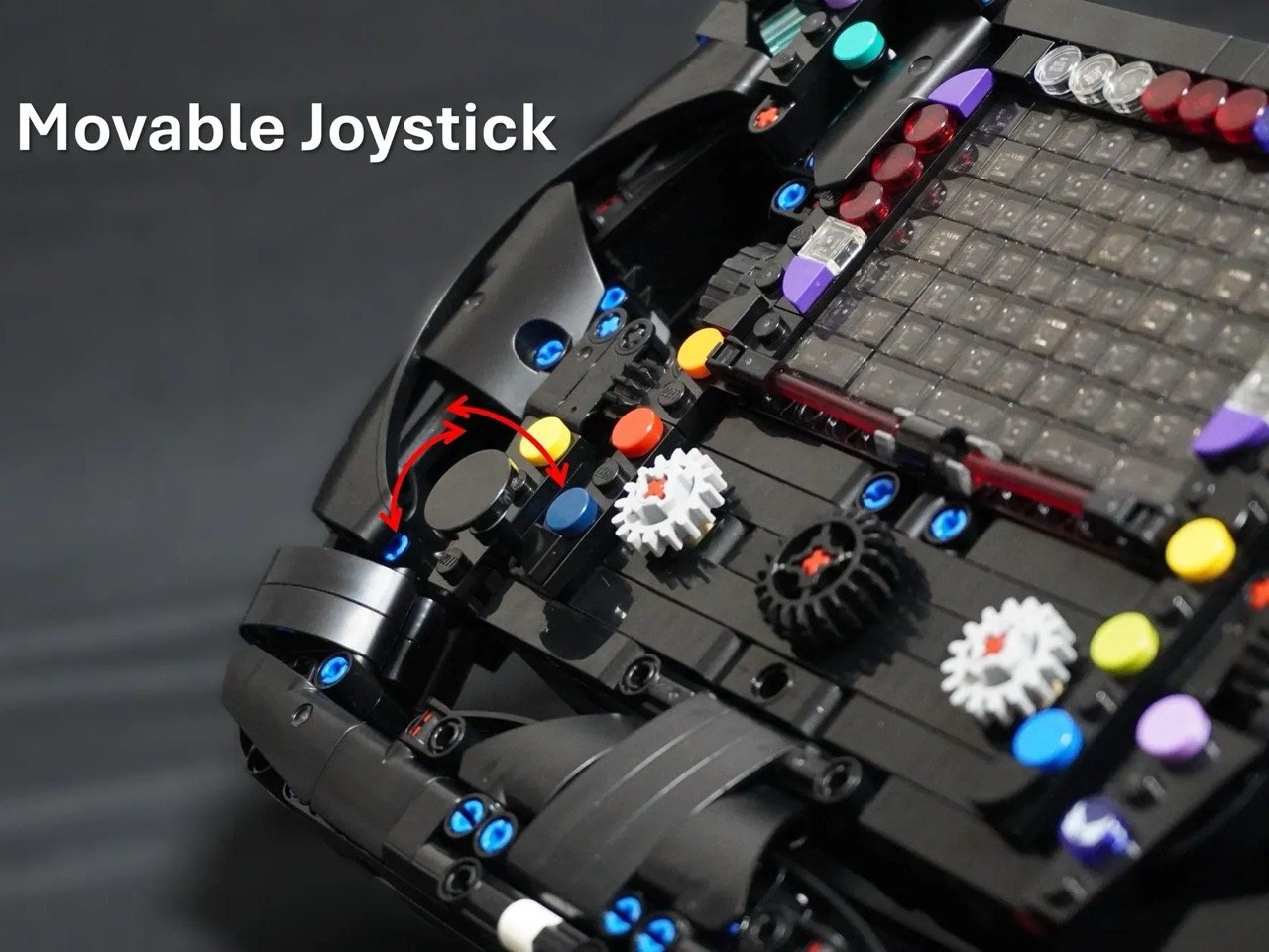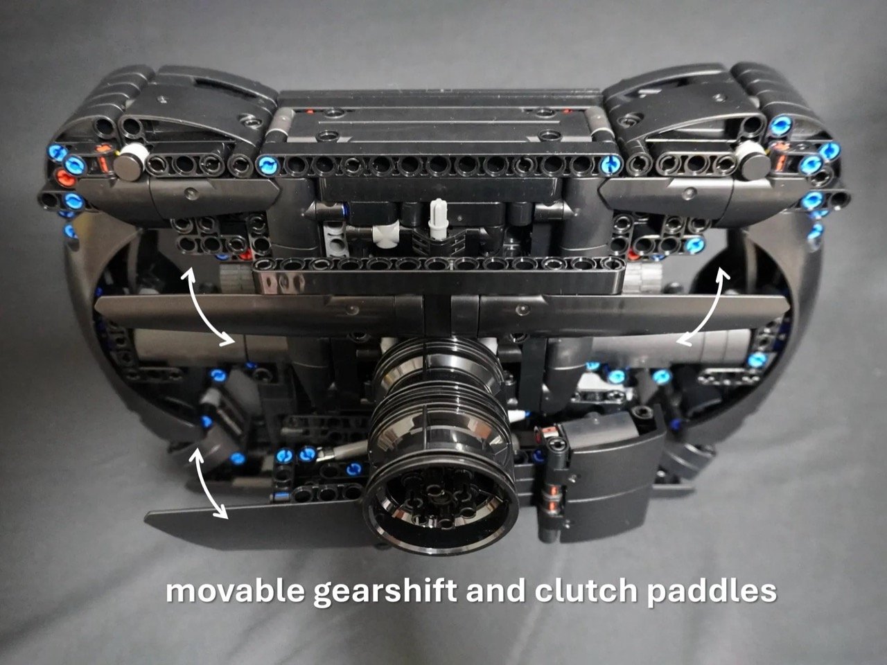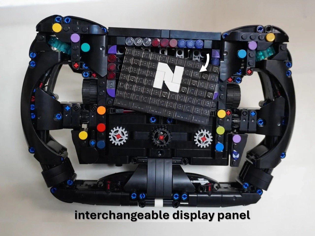 Outre l’affichage interchangeable et la construction à l’échelle 1:1, le volant oscille également entre plusieurs pièces fonctionnelles et mobiles, ajoutant du réalisme à l’ensemble. Les paddles de débrayage sont fonctionnels, le joystick s’articule, et les boutons rotatifs tournent. Contrairement aux volants statiques des ensembles de course officiels de LEGO, ces éléments ne sont pas simplement décoratifs, mais bien conçus pour l’interaction. LEGO offre effectivement des merveilles d’ingénierie, mais ceux-ci restent souvent figés et deviennent plus des objets de collection que des jouets. Avoir un volant que l’on peut saisir tout en faisant semblant de négocier un virage à Monza ? Cela transcende totalement le simple pas de mode d’engagement.