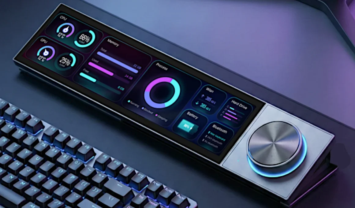 L’écran ultra-large présente une résolution de 1920 × 480 et peut atteindre 450 nits ou plus. Son format inhabituel est en fait un choix de conception réfléchi. Au lieu de ressembler à un petit moniteur, le panneau est conçu pour des surfaces de contrôle : des rangées de raccourcis tactiles personnalisables, des tableaux de bord d’état et des interfaces de réunion s’étendent horizontalement. Le bouton rotatif adjacent offre une rotation infinie avec un clic-poussoir et un anneau lumineux RGB changeant de couleur selon le mode de fonctionnement du Quake, transformant un simple dispositif d’entrée en indicateur de statut.
