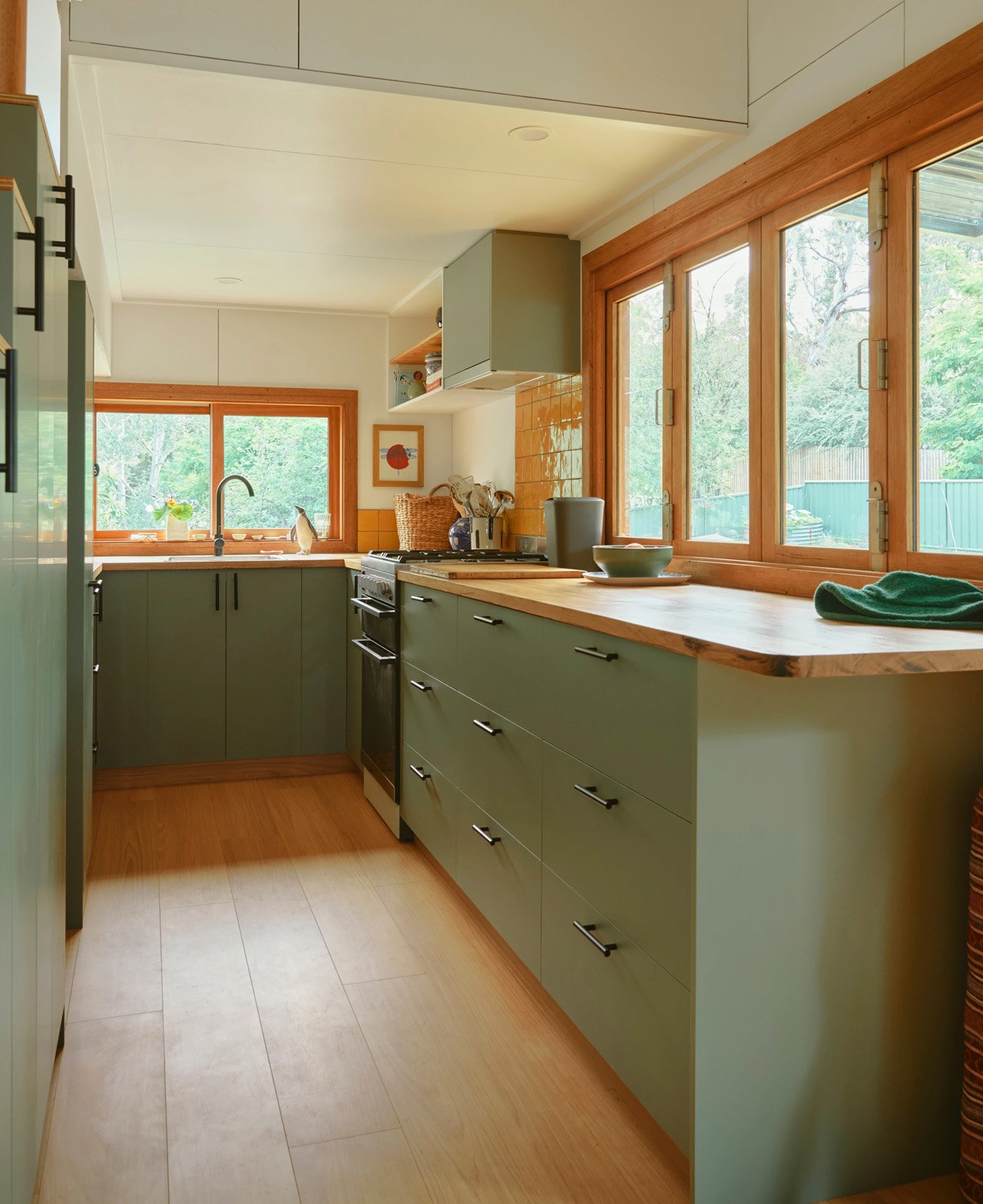 Le caractère distinctif du Caladenia réside dans son contraste spatial saisissant. À une extrémité, il y a une chambre en mezzanine accessible grâce à des escaliers intégrant des rangements, tandis que l’autre extrémité atteint une hauteur de plafond impressionnante de 3,2 mètres. Cela crée un salon et une salle à manger vastes, qui ne donnent absolument pas l’impression d’étouffement.