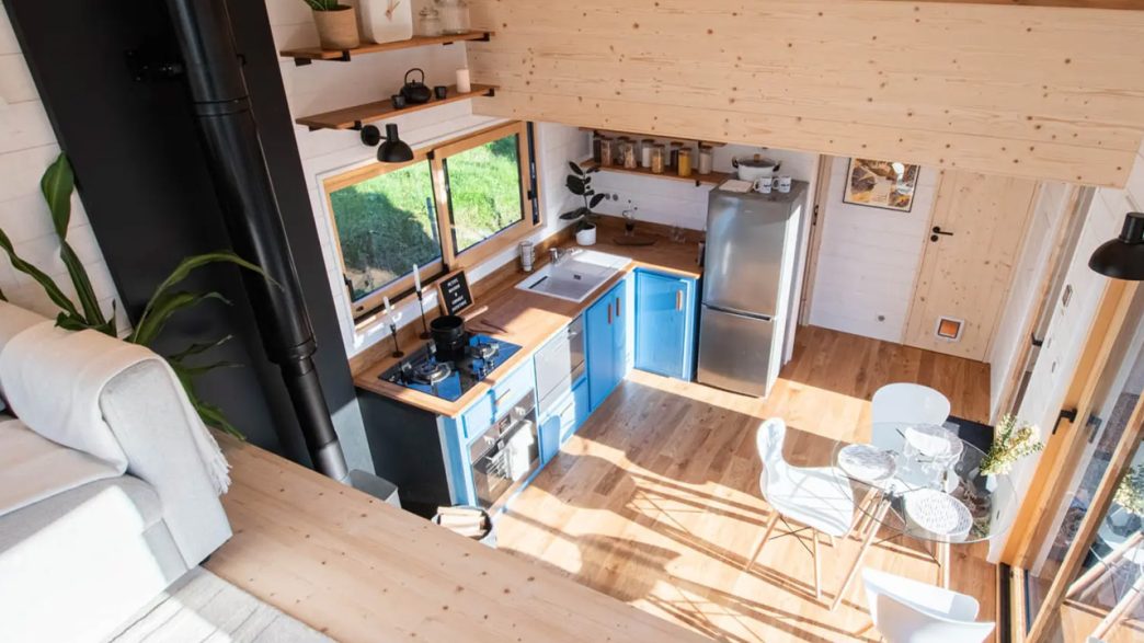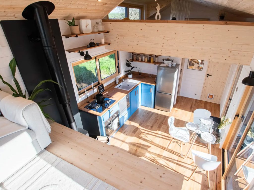 En entrant dans la maison, les visiteurs découvrent une cuisine spacieuse baignée de lumière, placée au cœur de l’habitat. La cuisine, astucieusement conçue, est équipée d’installations modernes comprenant un four, une cuisinière à trois feux au propane, ainsi qu’un réfrigérateur et un congélateur. Un lave-vaisselle, un ajout luxueux pour une maison miniature en France, permet de simplifier les tâches ménagères. À proximité de l’espace cuisine se trouve un poêle à bois compact, conçu pour chauffer efficacement toute la maison, garantissant un environnement chaleureux durant les mois plus frais.