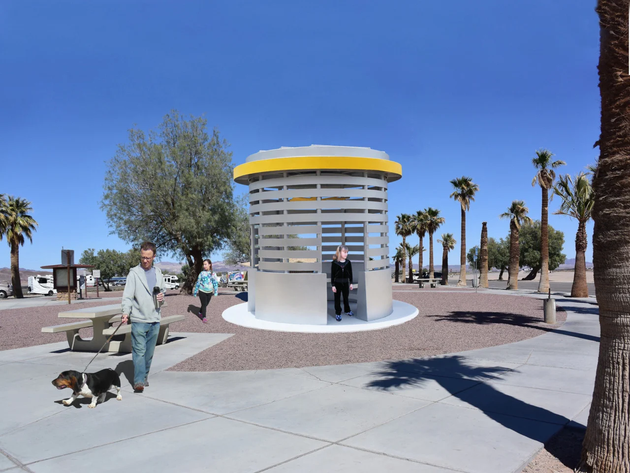 Les Cool Spots sont les plus autonomes du groupe. Chaque module cylindrique repose sur une base circulaire en béton, avec quatre grands bancs disposés autour d’une table centrale, et un ventilateur de plafond alimenté par l’énergie solaire au-dessus. Ces structures sont équipées d’éclairages nocturnes et de ports de recharge, prolongeant ainsi leur utilité jusqu’à tard dans la soirée. De plus, les modules peuvent fonctionner grâce à des batteries chargées par leurs propres panneaux solaires ou tirer de l’énergie du réseau électrique local au besoin.