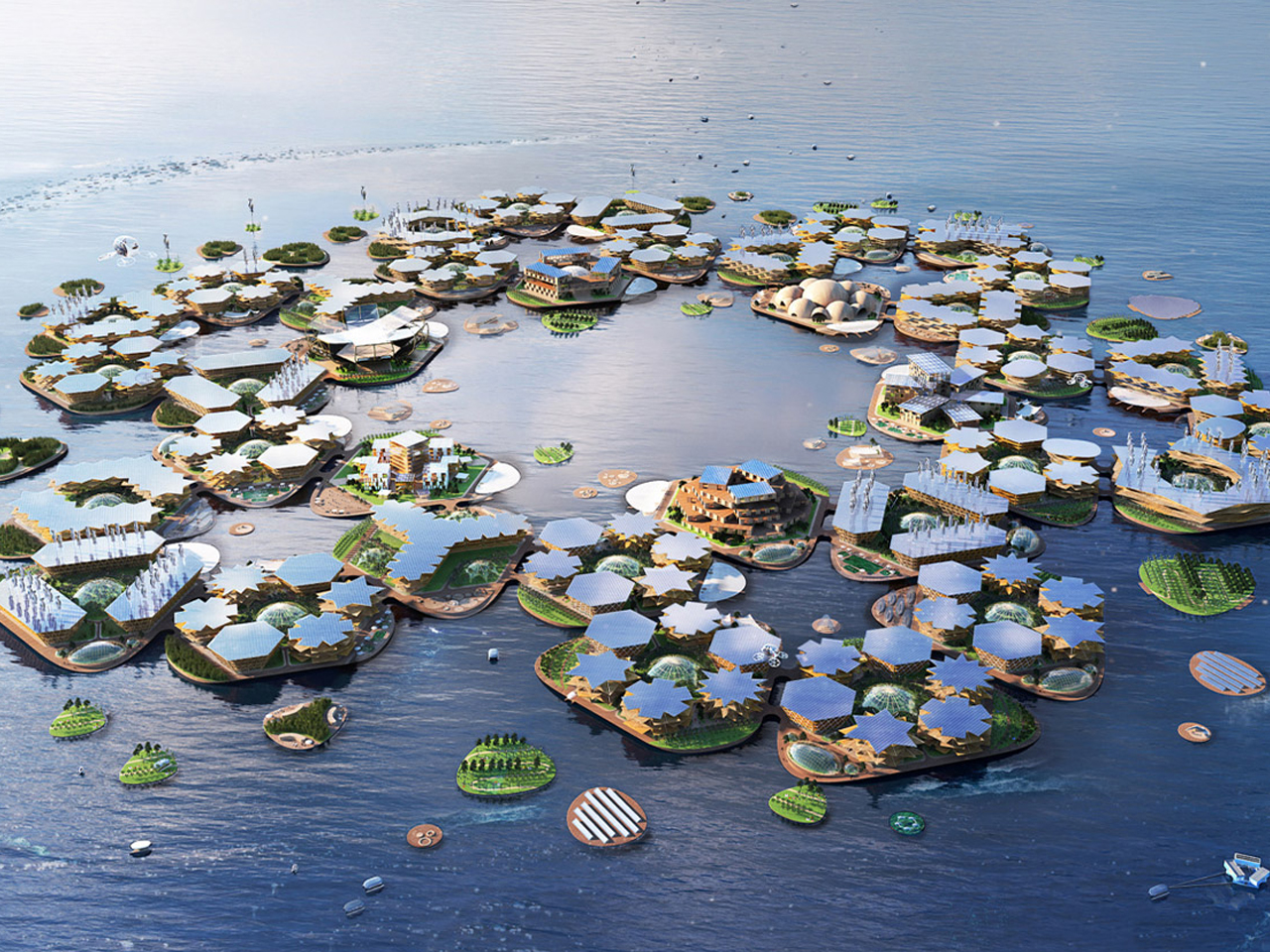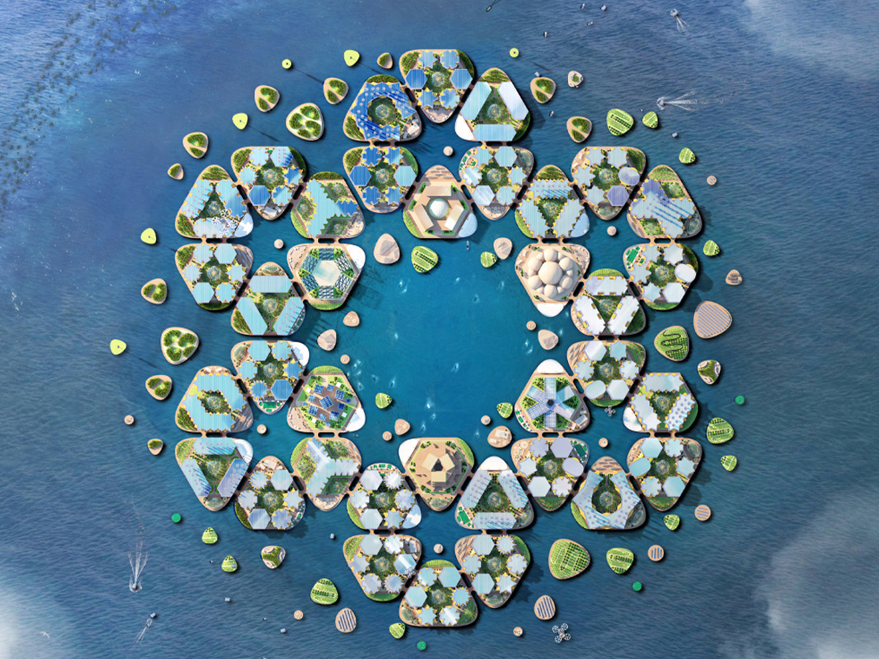 OCEANIX est un concept innovant de ville flottante développé par le groupe Bjarke Ingels (BIG), envisagé pour construction au large des côtes de la Corée du Sud. Le projet a reçu l’approbation de l’UN-Habitat et de la ville métropolitaine de Busan, le rapprochant de la réalité. Conçu comme un habitat entièrement durable, chaque module de 2 hectares abrite environ 300 résidents, et plusieurs modules peuvent être connectés pour former un village de 1 650 personnes. Ces quartiers flottants intègrent une agriculture sous-marine, des serres et des systèmes d’énergie renouvelable pour soutenir une autonomie à long terme.