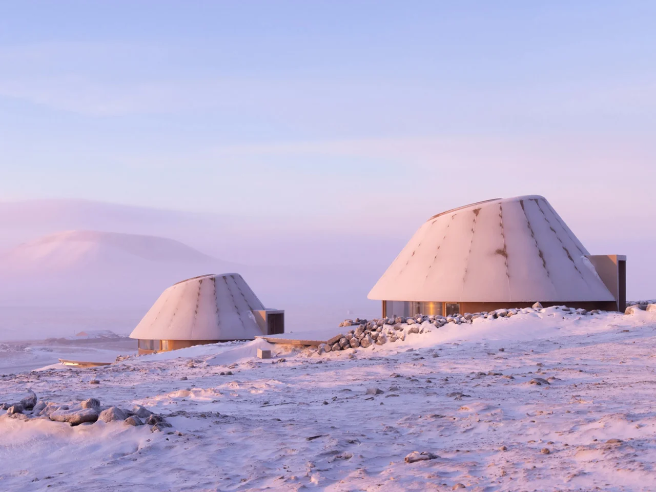 Chaque cabane offre une silhouette saisissante contre la vaste prairie. Des panneaux métalliques de couleur rougeâtre enveloppent les façades arrondies, évoquant la géologie volcanique en dessous, tandis qu’un toit en aluminium couronne les formes avec une ligne nette et réfléchissante. Ces unités sont légèrement surélevées, une légèreté délibérée qui limite leur empreinte au sol. Des murs de soutènement courbés servent également de protection contre le vent et la neige, face aux conditions climatiques rigoureuses qui balaient la région. La construction repose largement sur la préfabrication, avec des composants arrivant prêts à assembler sur place, minimisant l’utilisation de machinerie lourde et l’excavation profonde, un choix pragmatique pour un paysage aussi sensible.