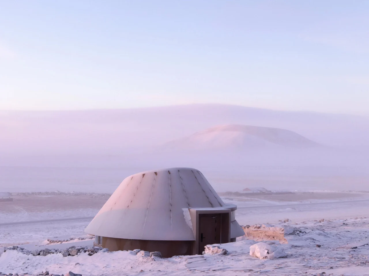 À l’intérieur, les cabines sont compactes mais soigneusement conçues. Chaque suite comprend un espace de sommeil, un coin salon confortable, une salle de bain et une terrasse extérieure privée. Le détail le plus mémorable se trouve au-dessus de la tête : un puits de lumière ovale placé directement au-dessus du lit, transformant le ciel nocturne mongol en un planétarium personnel. Une fenêtre horizontale étroite prolonge l’expérience vers l’extérieur, encadrant l’horizon volcanique dans une ligne ininterrompue.