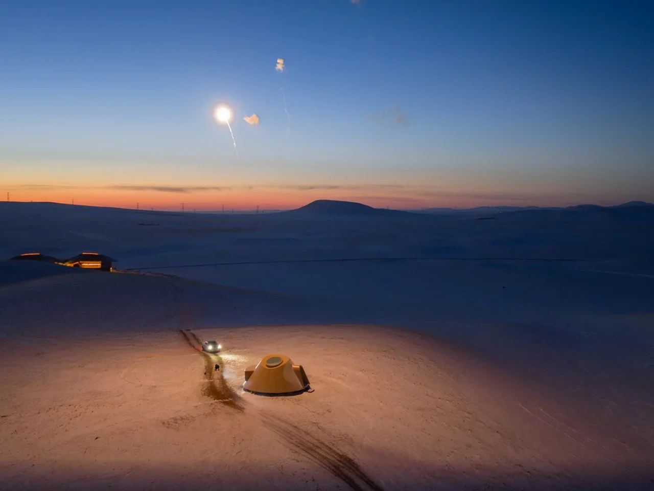 La disposition des cabines constitue le geste central du projet. En positionnant les suites d’invités directement au-dessus des dépressions de sable érodées, les architectes cherchent à stopper la perte de sol et à donner à la steppe une chance de se régénérer sous et autour des structures. Il s’agit d’une proposition inhabituelle — l’architecture comme un bandage écologique — dont le succès ne se révélera qu’après des années d’observation minutieuse.
