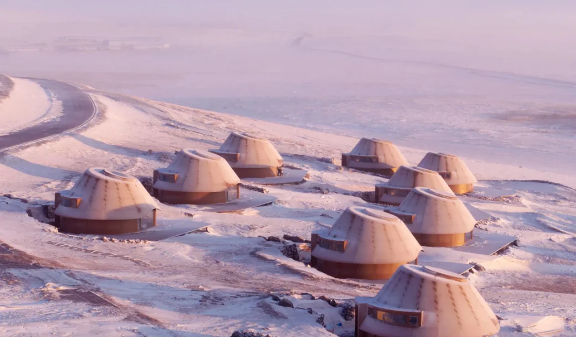 Chaque cabane offre une silhouette saisissante contre la vaste prairie. Des panneaux métalliques de couleur rougeâtre enveloppent les façades arrondies, évoquant la géologie volcanique en dessous, tandis qu’un toit en aluminium couronne les formes avec une ligne nette et réfléchissante. Ces unités sont légèrement surélevées, une légèreté délibérée qui limite leur empreinte au sol. Des murs de soutènement courbés servent également de protection contre le vent et la neige, face aux conditions climatiques rigoureuses qui balaient la région. La construction repose largement sur la préfabrication, avec des composants arrivant prêts à assembler sur place, minimisant l’utilisation de machinerie lourde et l’excavation profonde, un choix pragmatique pour un paysage aussi sensible.