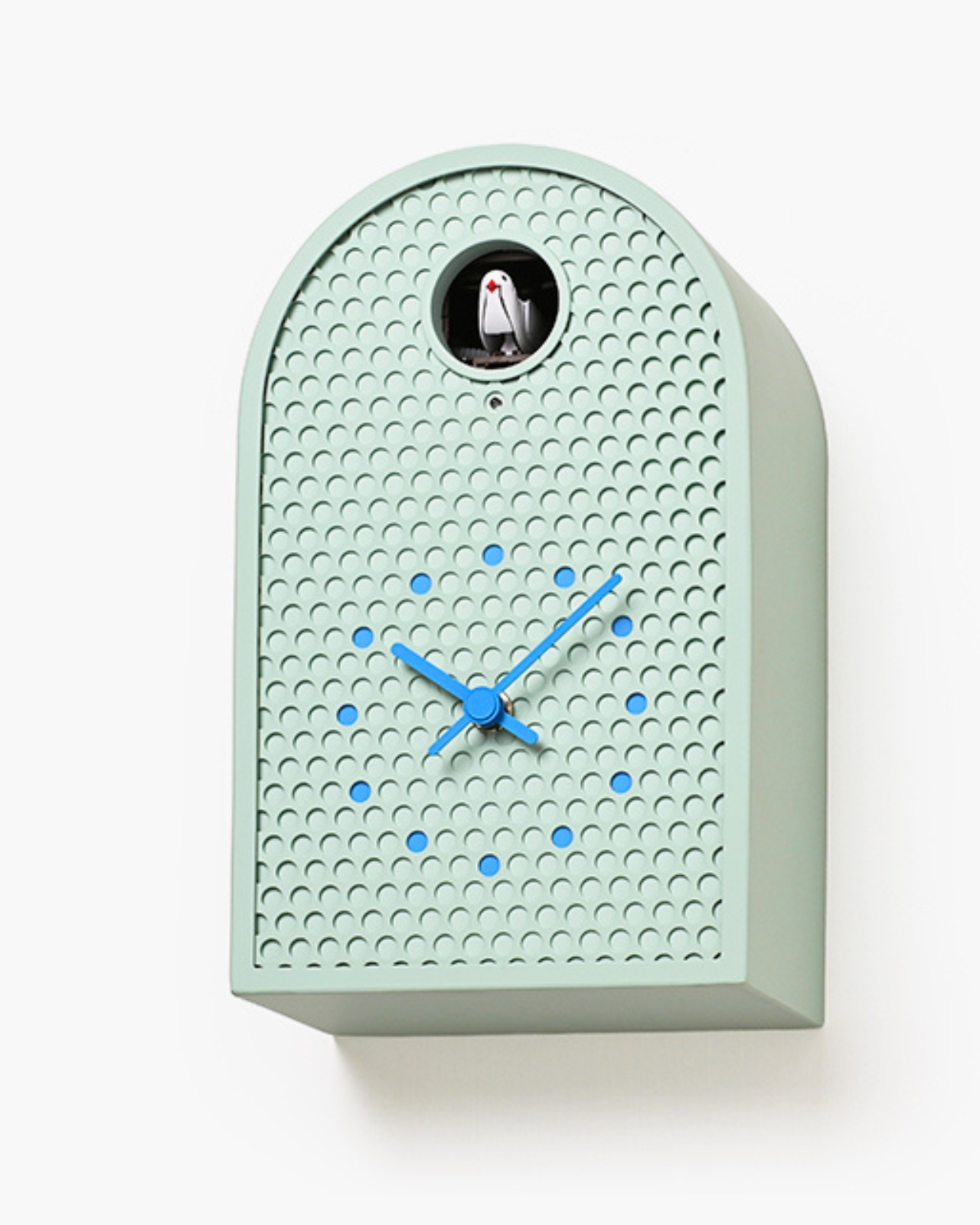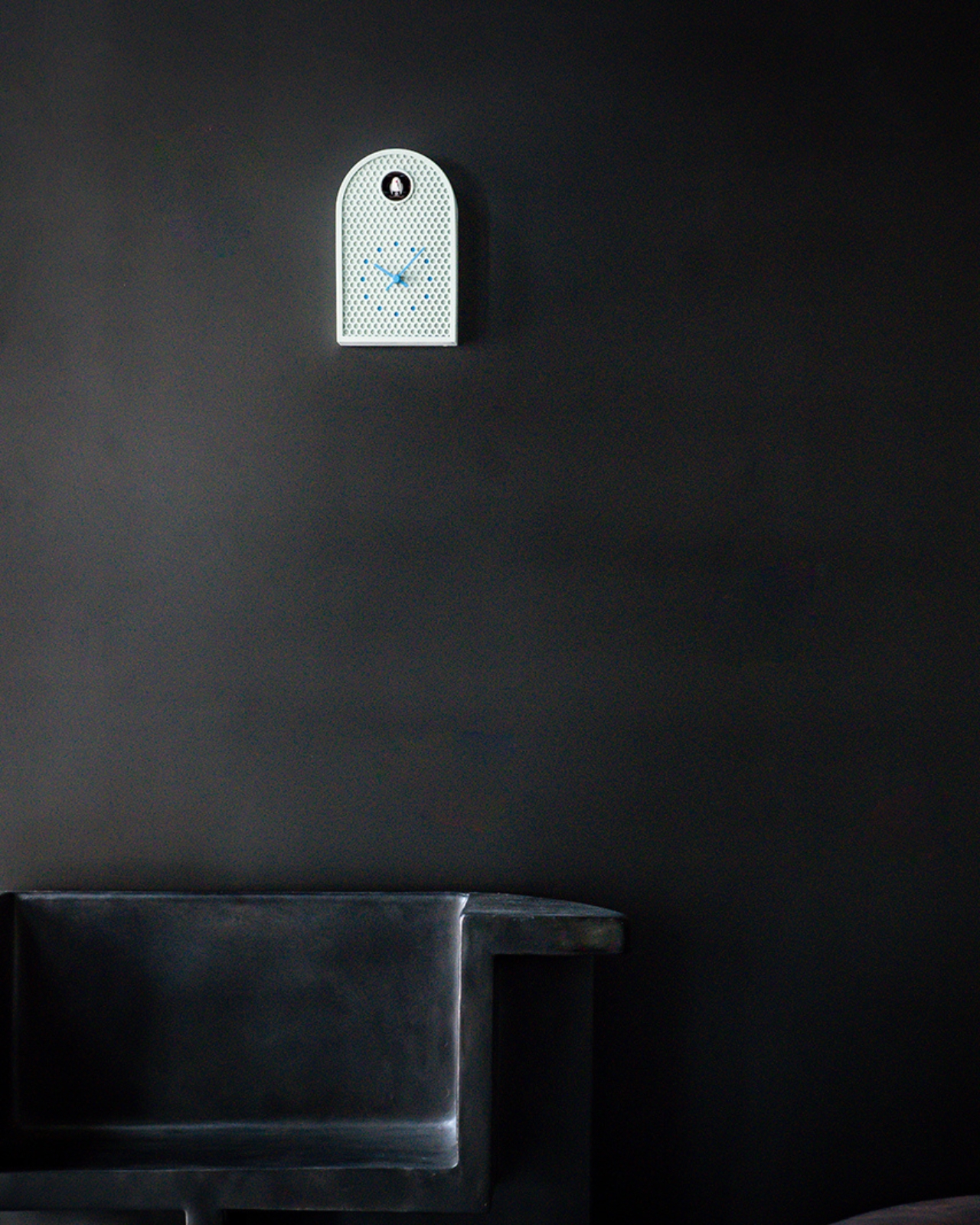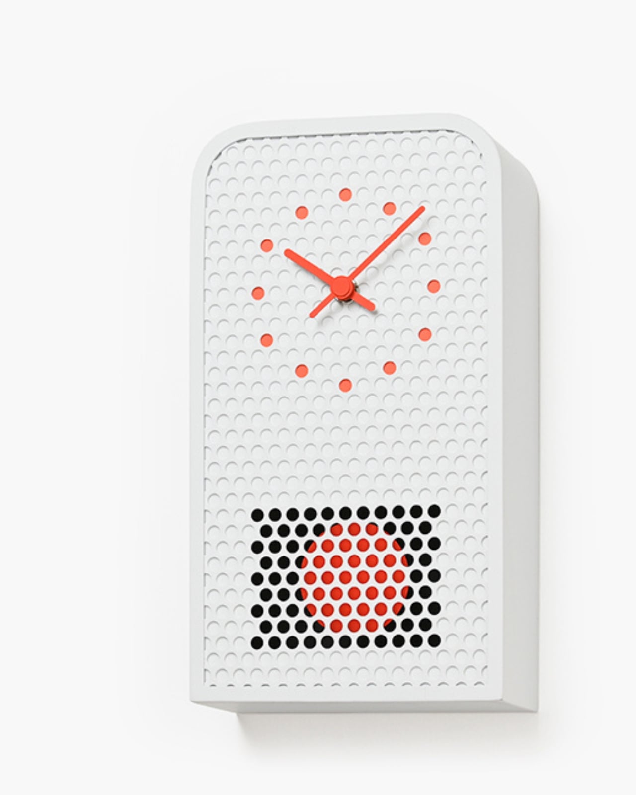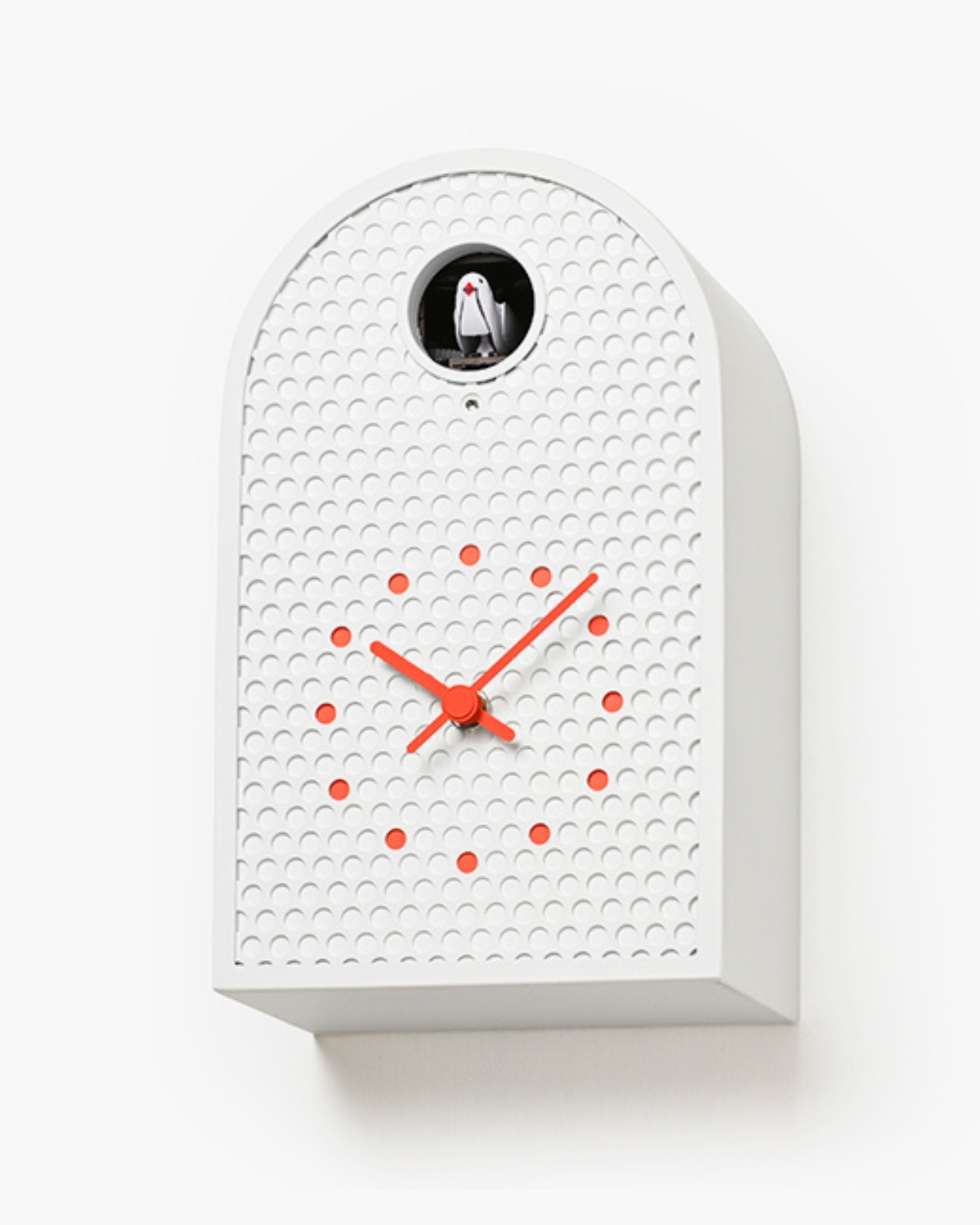 De son côté, l’horloge COO présente un grand ouverture circulaire où un coucou apparaît pour indiquer l’heure. Cet oiseau mécanique déploie ses ailes et chante une version mélodique du classique son de coucou. La forme de l’horloge s’inspire des fenêtres cintrées des temps anciens. Comme pour le modèle MOOV, les indicateurs sont également colorés pour s’accorder avec les perforations métalliques. La fusion des matériaux industriels et des éléments antiques confère à cette horloge une chaleur singulière, tant moderne que nostalgique.