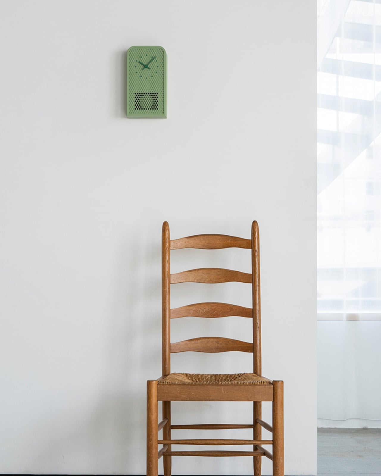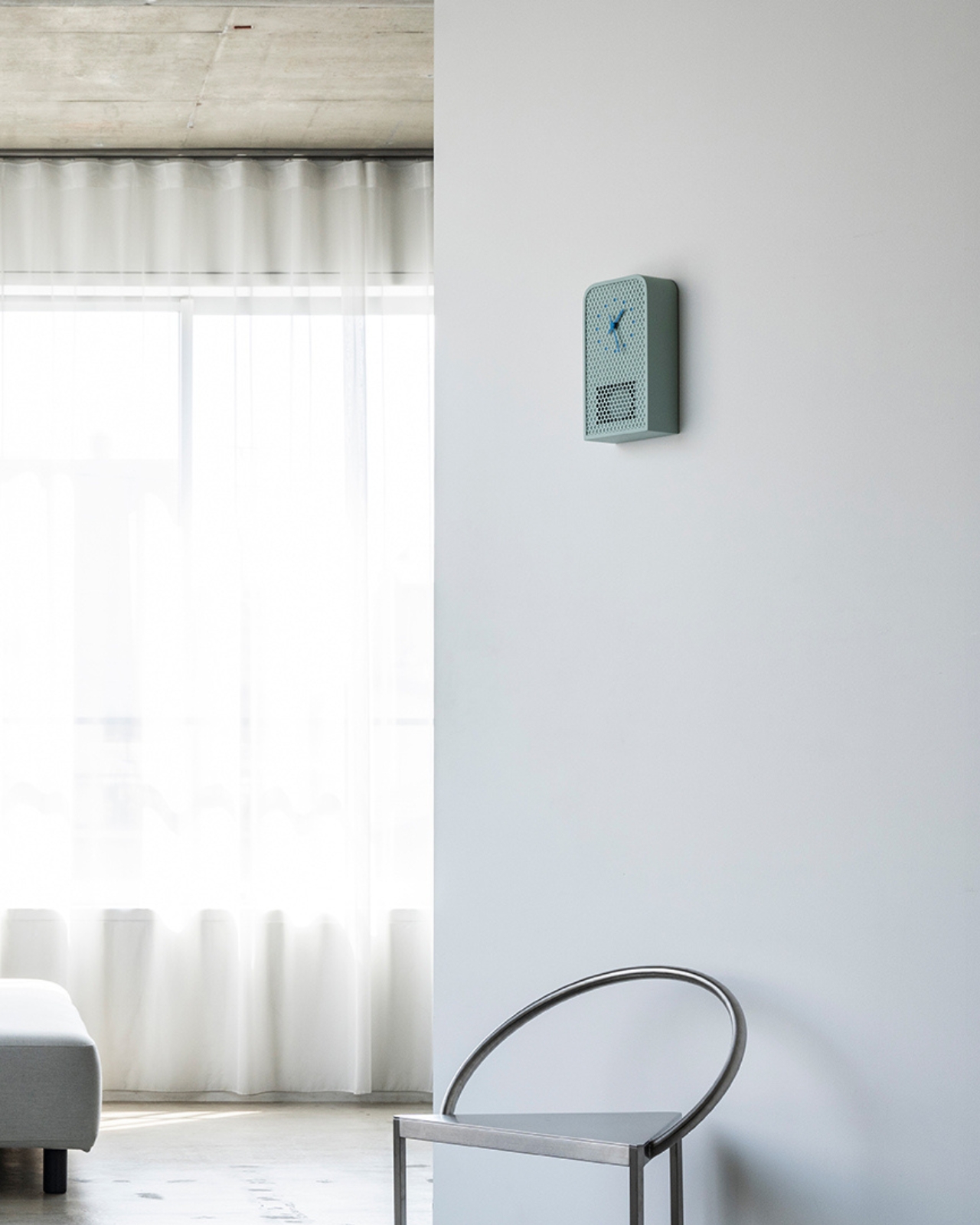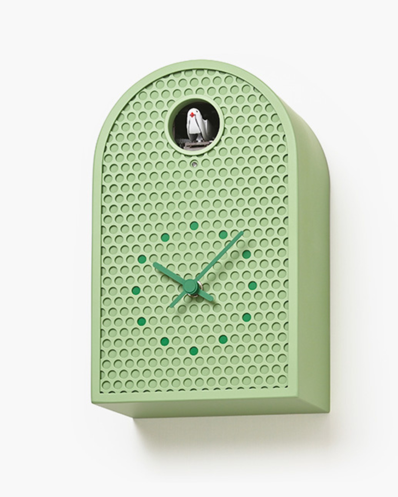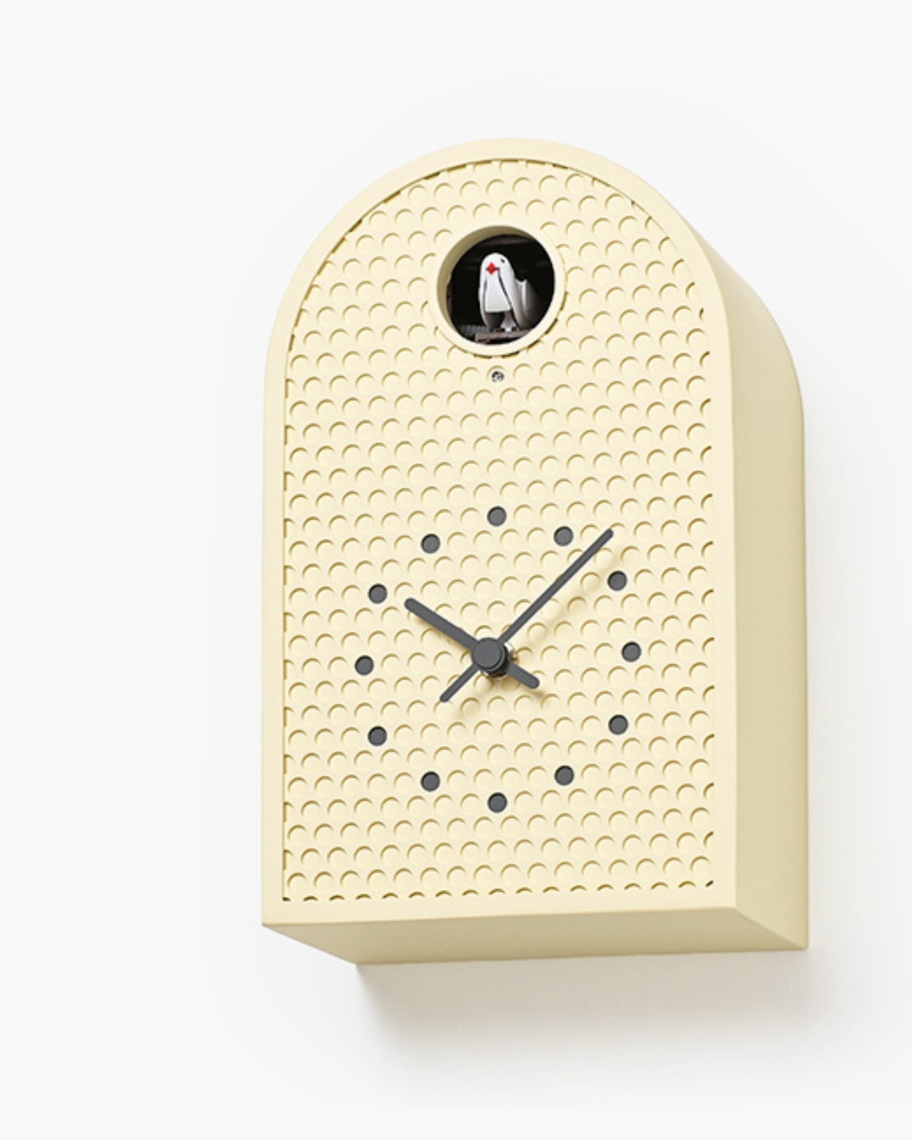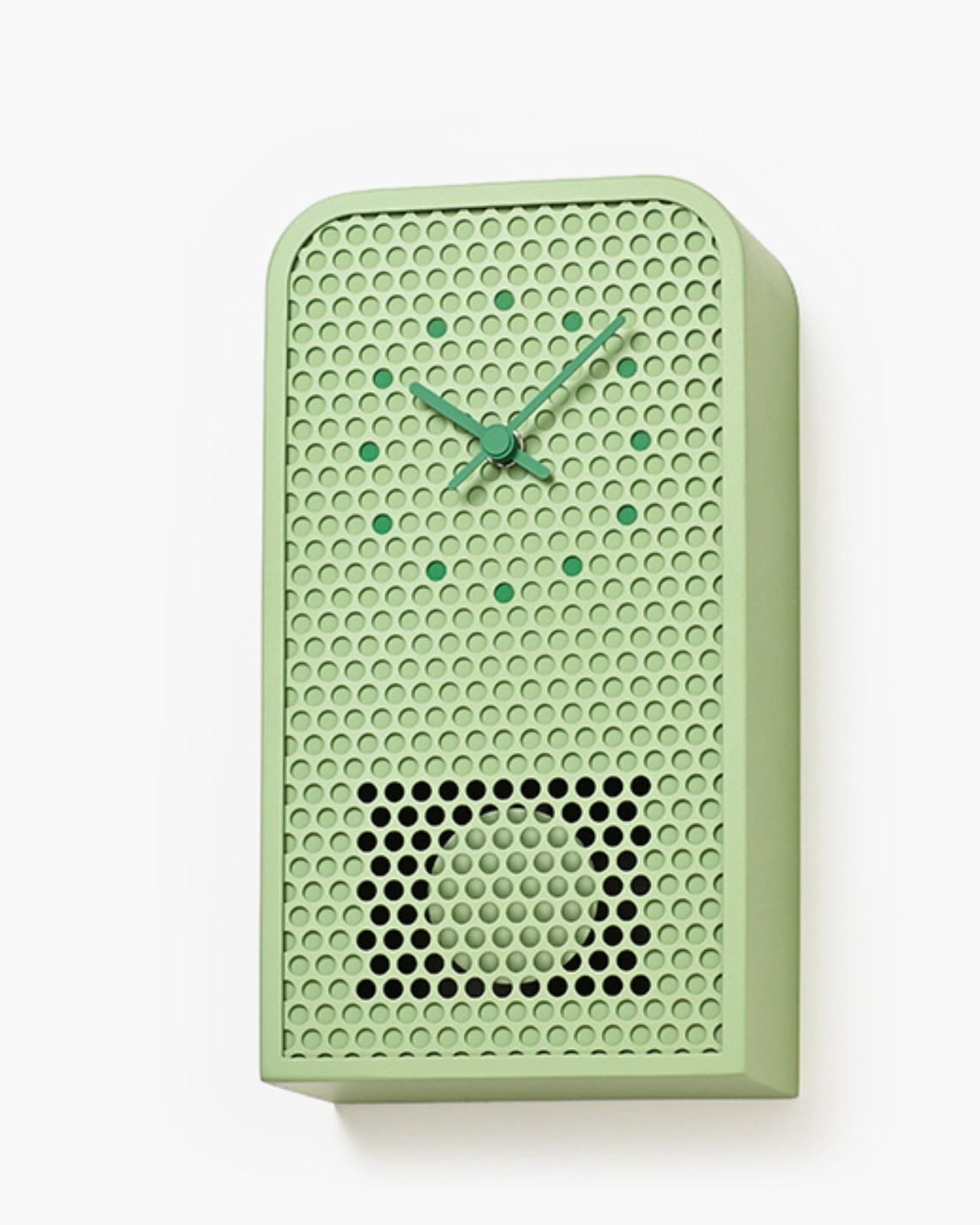De son côté, l’horloge COO présente un grand ouverture circulaire où un coucou apparaît pour indiquer l’heure. Cet oiseau mécanique déploie ses ailes et chante une version mélodique du classique son de coucou. La forme de l’horloge s’inspire des fenêtres cintrées des temps anciens. Comme pour le modèle MOOV, les indicateurs sont également colorés pour s’accorder avec les perforations métalliques. La fusion des matériaux industriels et des éléments antiques confère à cette horloge une chaleur singulière, tant moderne que nostalgique.