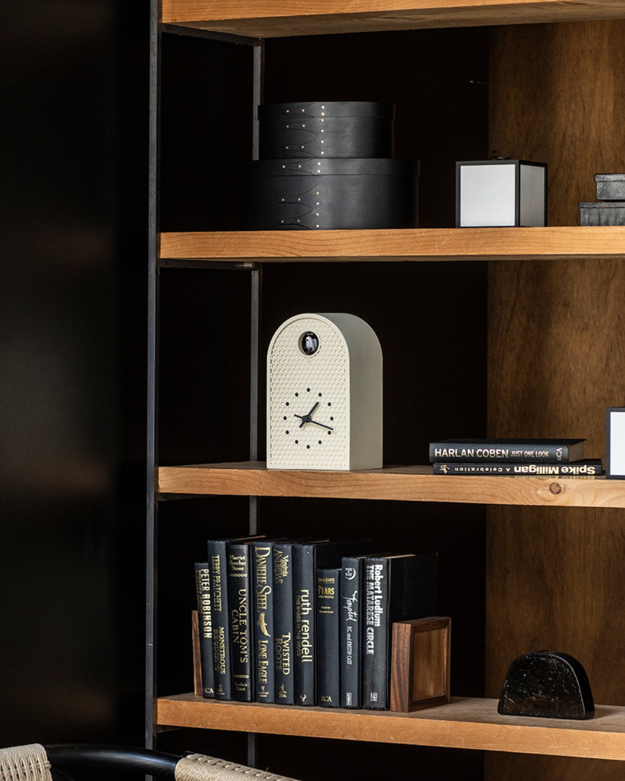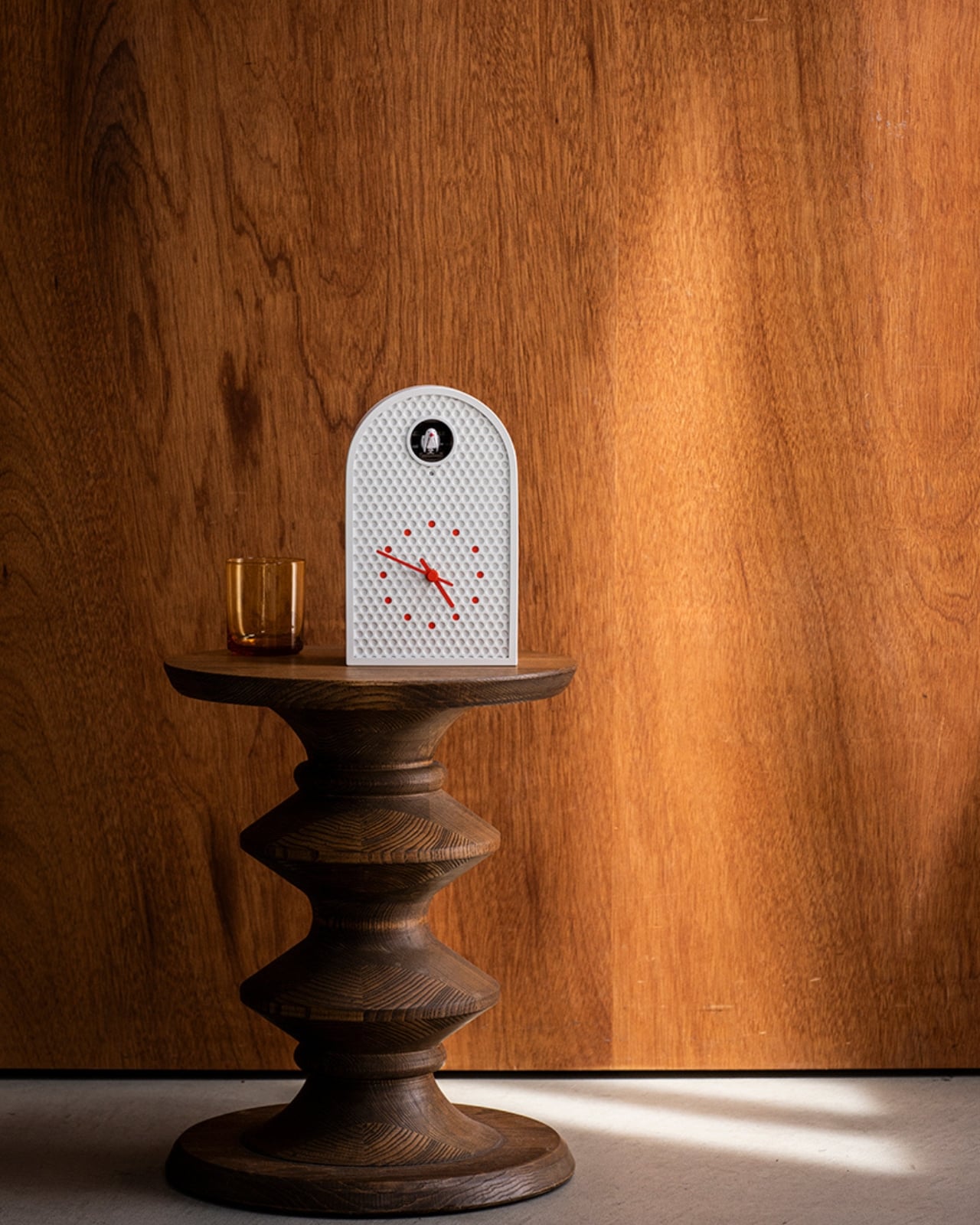 L’horloge COO dispose d’une ouverture circulaire où un coucou apparaît pour indiquer l’heure. Son design s’inspire des fenêtres arquées anciennes, combinant des éléments industriels avec une touche nostalgique.