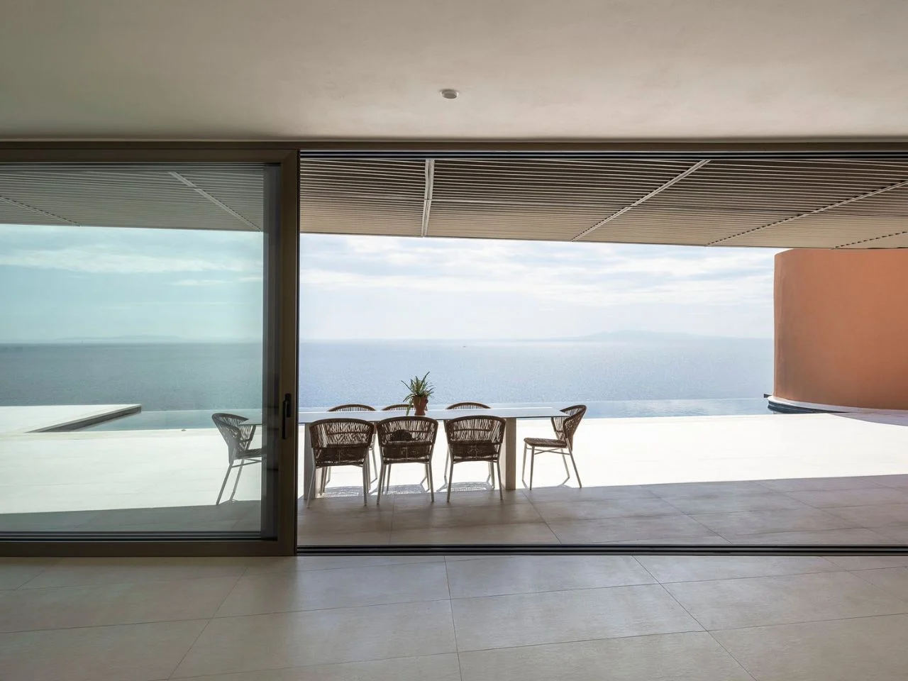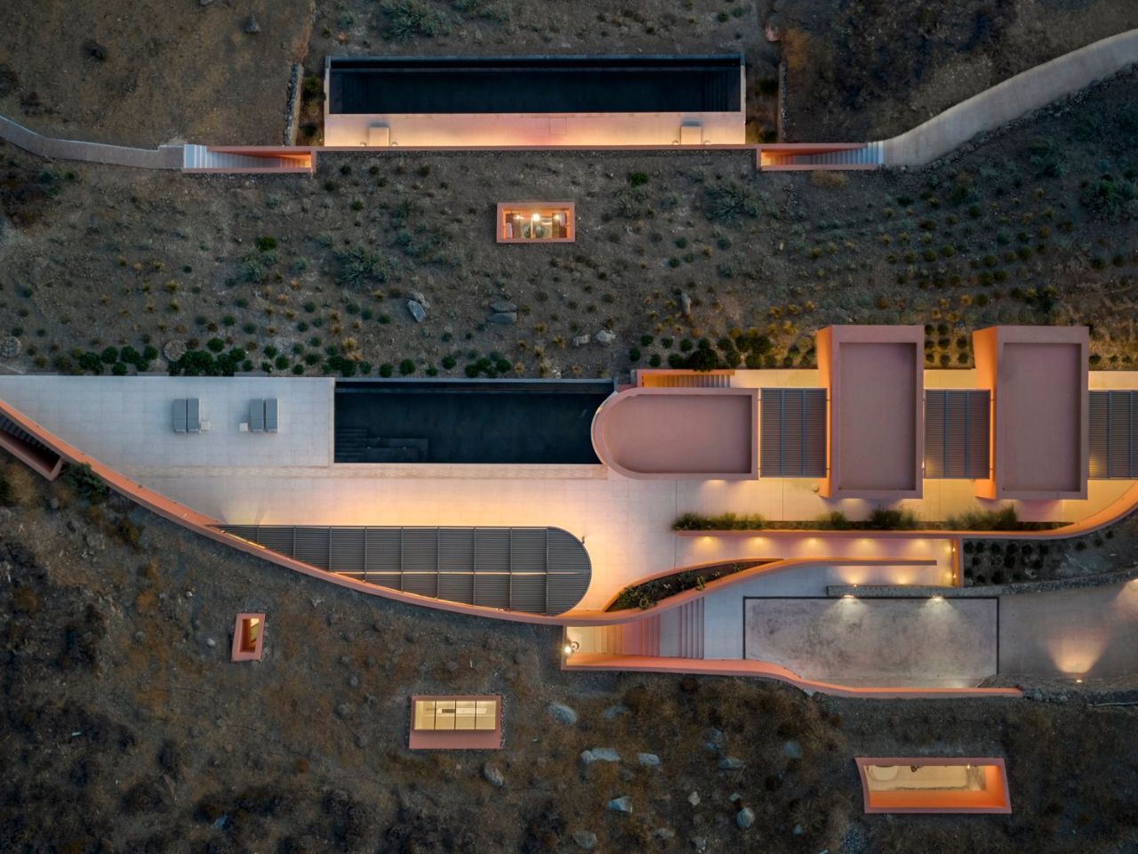 Au sommet se trouve The Plane, qui sert de cœur social au complexe. Un mur de soutènement incurvé entoure une grande terrasse qui s’ouvre sur la mer. Ici, une pergola sculpturale en forme de feuille offre de l’ombre, tandis qu’une piscine reflète l’horizon bleu au-delà. Sous cette terrasse, des espaces de vie partagés et une chambre sont incrustés dans la colline. À proximité, trois chambres supplémentaires s’étendent en formes cubiques simples qui encadrent les vues sur la mer.