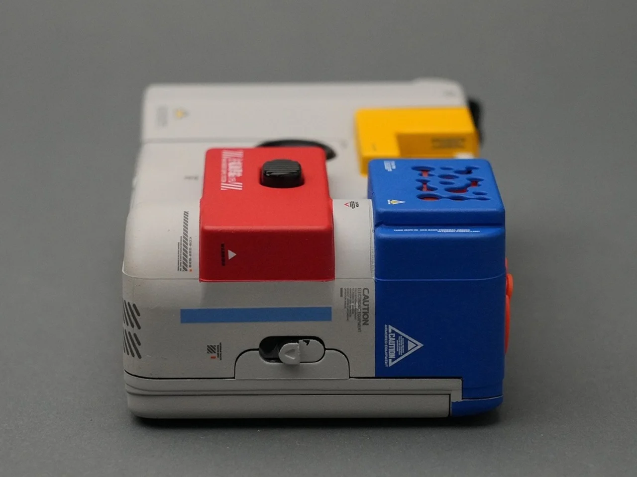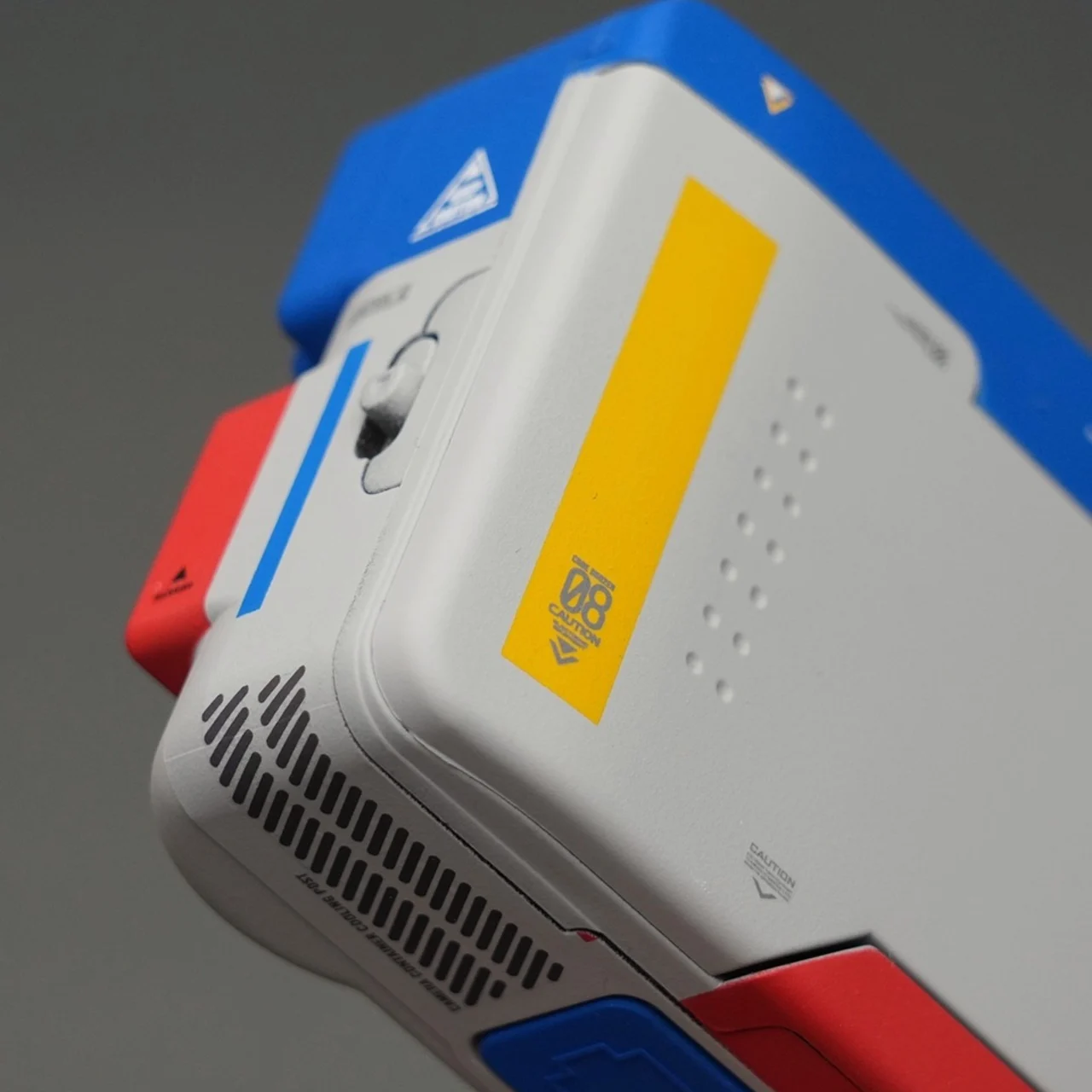 La palette de couleurs de la caméra est indéniablement inspirée par le RX-78-2, avec une base blanche et gris clair, agrémentée de blocs emblématiques de rouge, bleu et jaune. Le module bleu en haut évoque les ouvertures de la tête du mecha, tandis que le panneau rouge porte des inscriptions japonaises traduisant « Système d’Alimentation Énergétique Principal ». Des étiquettes d’avertissement et des marqueurs de précaution ornent chaque surface, conférant à cet objet l’aspect d’un véritable matériel militaire.