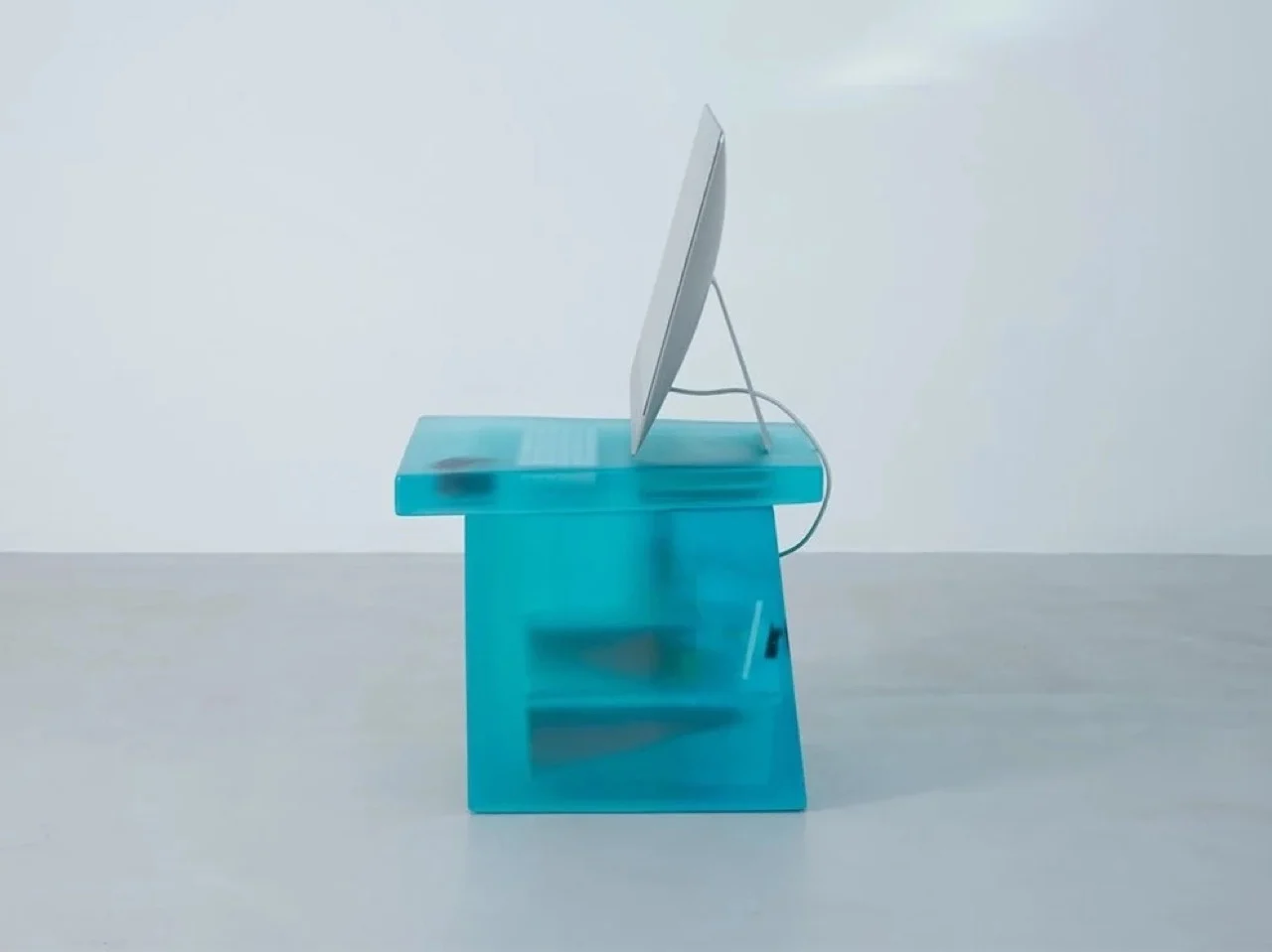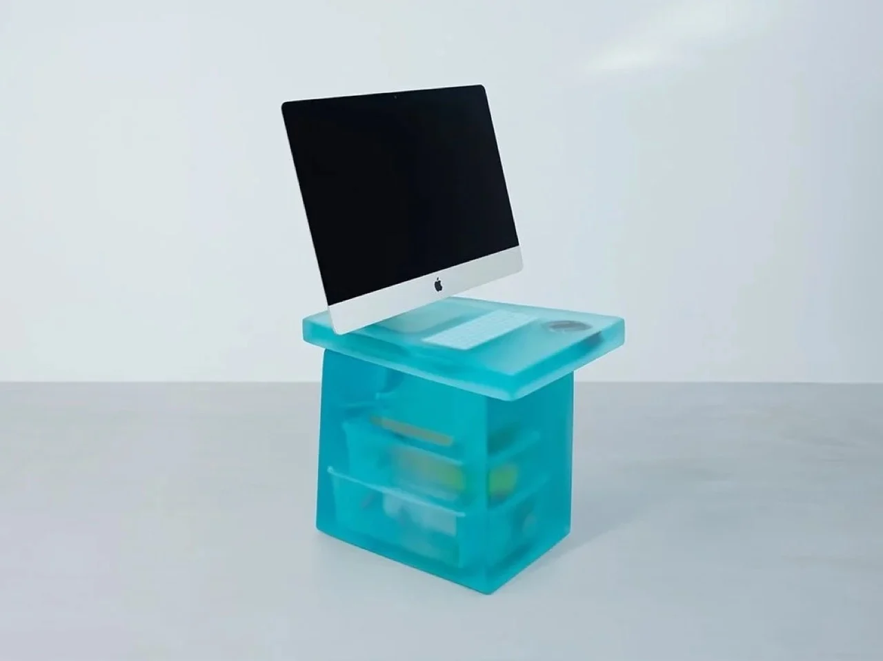 Le bloc de résine dans lequel ces éléments sont scellés est là où le design devient captivant. Lim a pris soin de créer une œuvre qui va au-delà d’un simple objet fonctionnel. Les bacs de rangement, souvent utilisés pour des objets divers comme des câbles USB, sont visibles à travers une résine cyan semi-translucide. Les contours de ces objets se confondent délicatement avec la surface, offrant un contraste intéressant entre ce qui est identifiable et ce qui se dissout dans le flou.