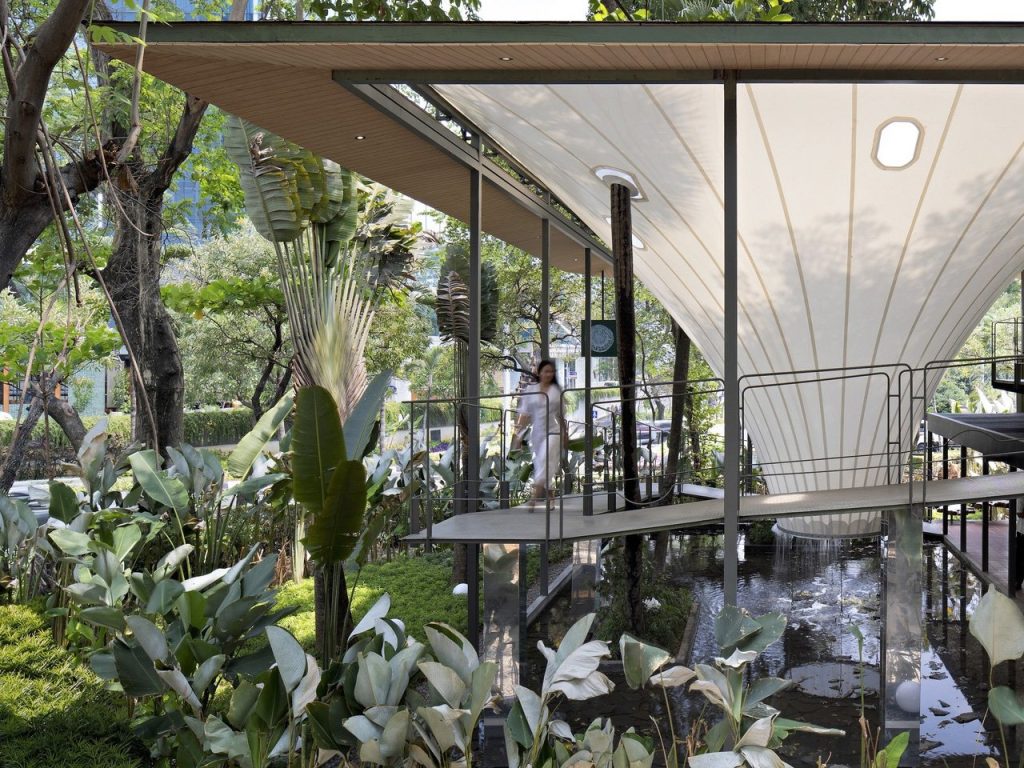Niché dans le quartier des affaires de Jakarta, le Stalk Tree-Hugger se distingue par son architecture captivante conçue par le studio RAD+ar. D’une élégance impressionnante, cette structure recouvre cinq arbres majestueux avec un tissu paramétrique, créant ainsi un jeux envoûtant de lumière et d’ombres qui soutient diverses activités commerciales. Ce projet met l’accent sur la création d’une expérience spatiale unique tout en adoptant une approche simple et fonctionnelle. La conception veille à s’harmoniser parfaitement avec la verdure environnante.