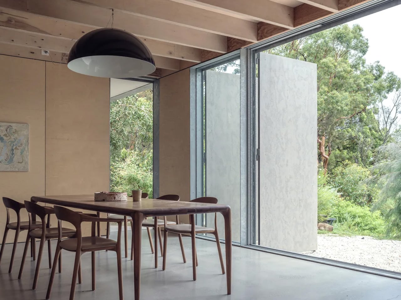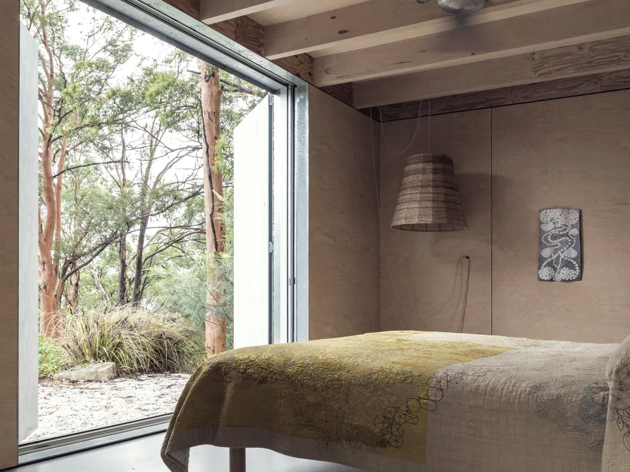 Les choix de matériaux reflètent la réalité de la construction dans des zones sensibles aux feux de brousse, avec une palette délibérément brute et robuste, incluant du contreplaqué, un revêtement léger et du métal, offrant protection contre le feu et nécessitant peu d’entretien.